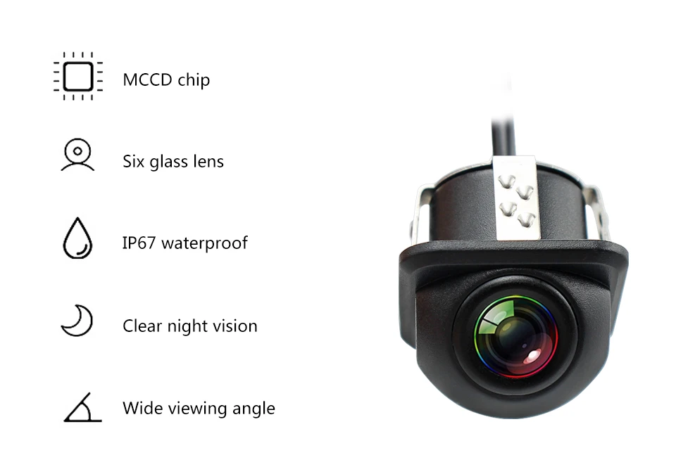 • MCCD 2020 новые импортные 4089T чипы CCD Реверсивный трек с отличной четкостью изображения, стабильностью и ночным видением пикселей 1280*720P HD. • Поддержка видеосистемы NTSC. Высокая степень водонепроницаемости: IP67. • Мощность: 12 В постоянного тока • Высокая четкость и угол обзора 170 градусов. Как рыбий глаз. • Низкий светильник ночного видения, 15 м видимое расстояние для ночи. • Может использоваться в качестве камеры заднего вида. • 6M RCA видео разъем. Подходит для dvd-плеера Android и любого автомобильного монитора TFT. • Подходит для любой модели автомобиля. Против царапин. Водонепроницаемый.