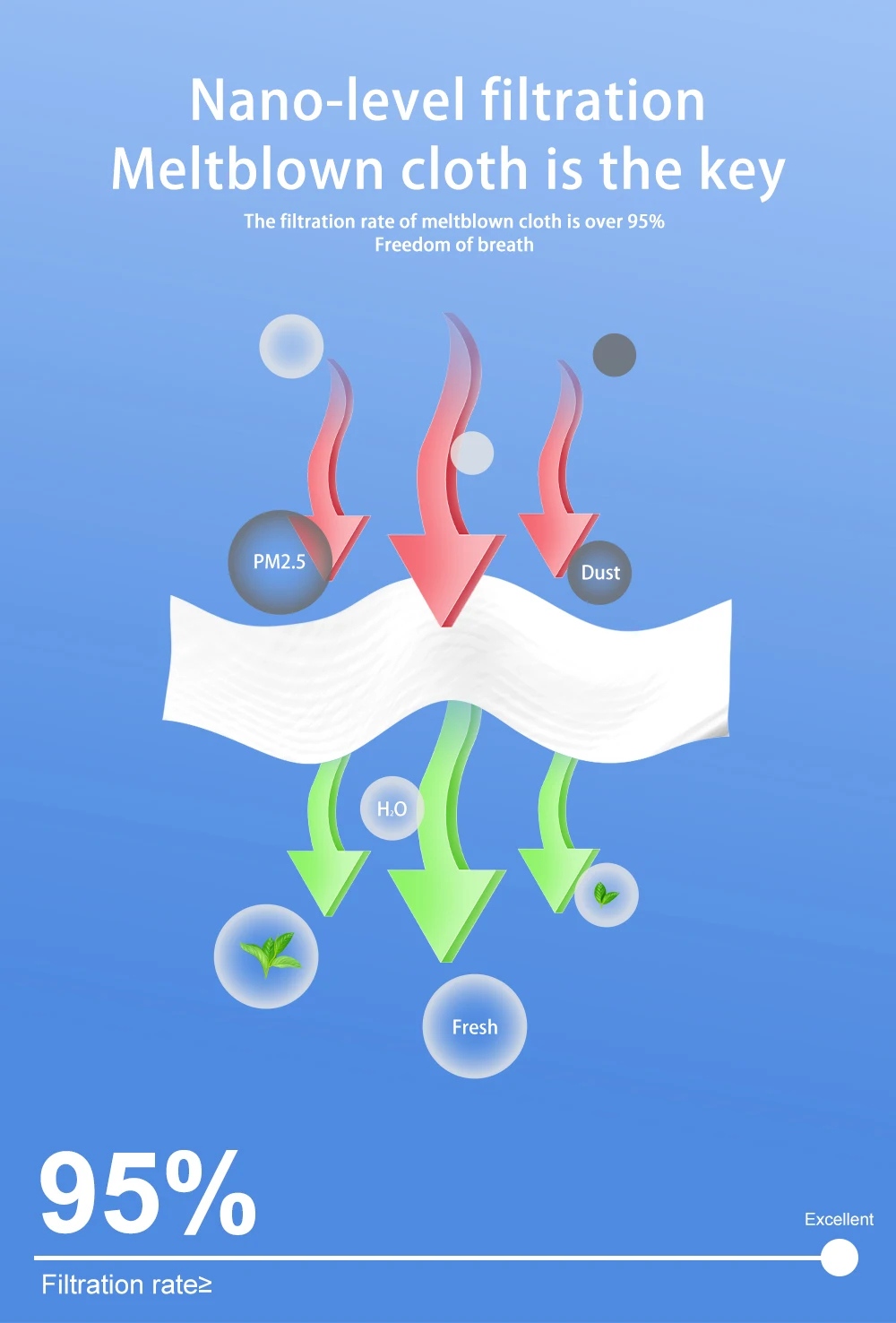 Маска может изолировать мелкие частицы и плотно прилегает к лицу, ее нелегко пропускать воздух с периферии, а эффективность фильтрации твердых частиц может достигать 95% при стандартных условиях.