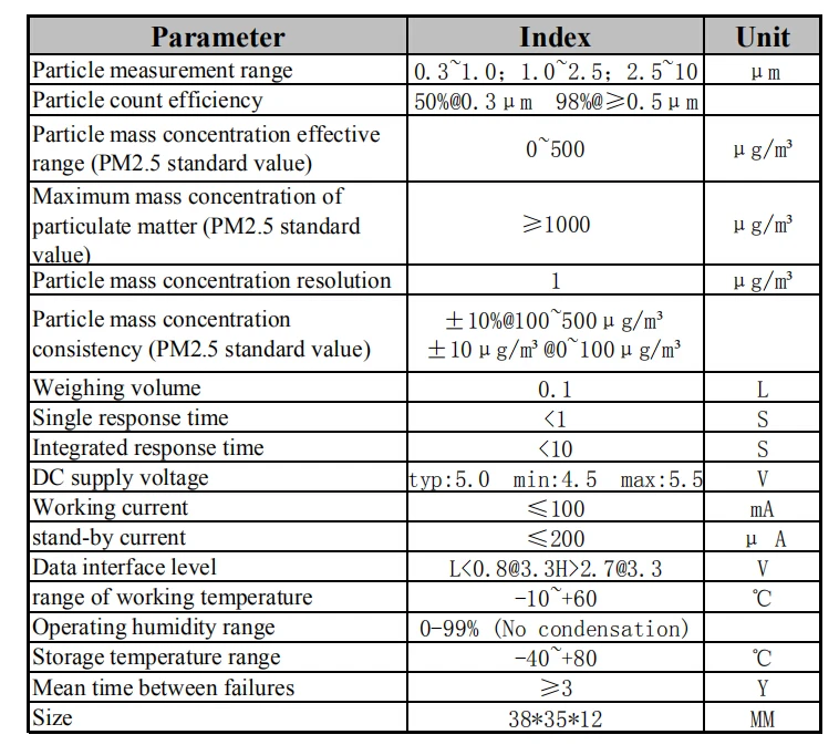 Это цифровой общего назначения концентрации частиц датчик, который может использоваться для того, чтобы получить 0,3 до 10 микрон взвешенными твердыми частицами на единицу объема воздуха, то есть, концентрации частиц, а на выходе как цифровых интерфейса сочетаются. Датчик может быть встроен в различные концентрации взвешенных твердых частиц в воздухе, связанные с измерительным оборудованием или оборудованием для улучшения окружающей среды, для обеспечения своевременных и точных данных о концентрации.