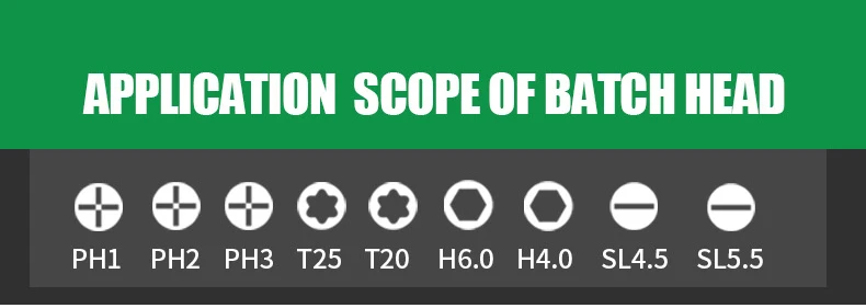 PH1: подходит для небольших бытовых приборов и т. Д.; PH2: подходит для различных случаев, таких как компьютеры, бытовая техника, переключатели, дверные замки и т. д.; PH3: подходит для разборки винтов промышленного оборудования и других неповседневных бытовых размеров; T25: подходит для демонтажа элементов воздушного фильтра Volkswagen, Magotan, Sail и т. д.; T30: подходит для удаления вытяжки, cd-плееров, воздушных фильтров BMW и Benz и т. д.; H6.0: подходит для сборки и разборки обычных винтов, таких как мотоциклы, велосипеды и сиденья; H4.0: подходит для удаления обычных винтов, таких как велосипеды, сиденья, столы и т. д.; SL4.5: подходит для бытовой техники, компьютеров и т. Д.; SL5.5: подходит для общего обслуживания, демонтажа бытовой техники, компьютеров и т. д.