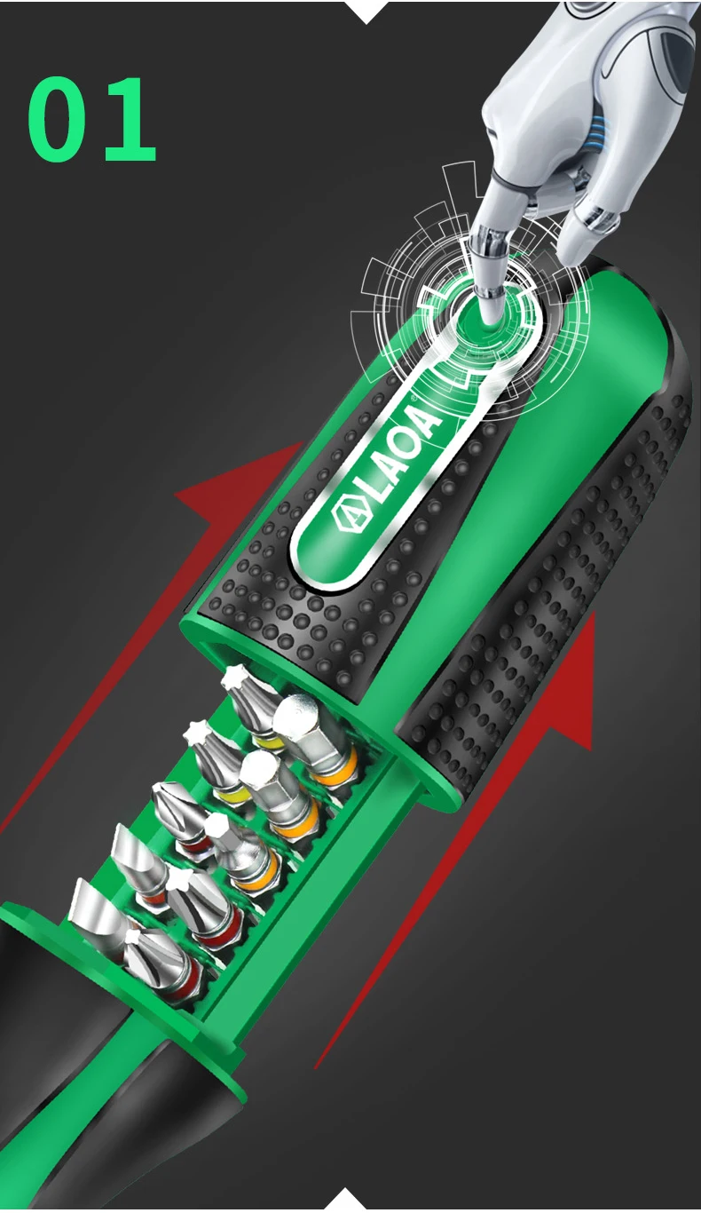 1. Ручка изготовлена из материала PP + TPR, который удобно держать; 2. ХРАПОВИК с высоким крутящим моментом имеет три структуры: вперед, назад и фиксируется Прост в использовании. 3. Дизайн скрытого журнала не занимает места и удобен для хранения; 4. 10 штук 25 мм обычных бит, которые могут удовлетворить потребности повседневной жизни.