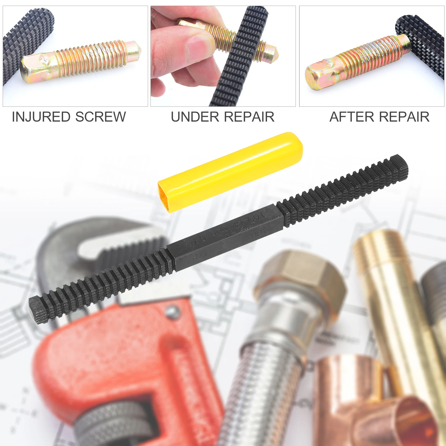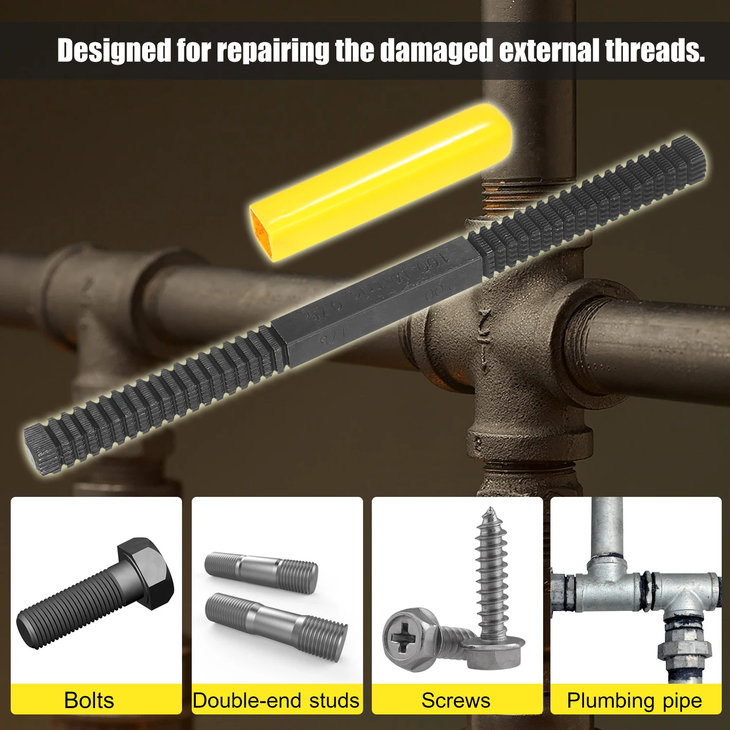 Designed for repairing the damaged external threads on studs, bolts, screws, plumbing pipe and pipe fittings.