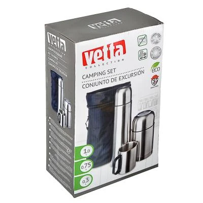 The hiking set is packed in a comfortable black bag consists of thermoses of 1.0L and 0.75l with a metal bulb and in a silver-colored stainless steel case, which is can be with screw plastic stopper and with lid and Thermos mug of 300 ml stainless steel with plastic handle.