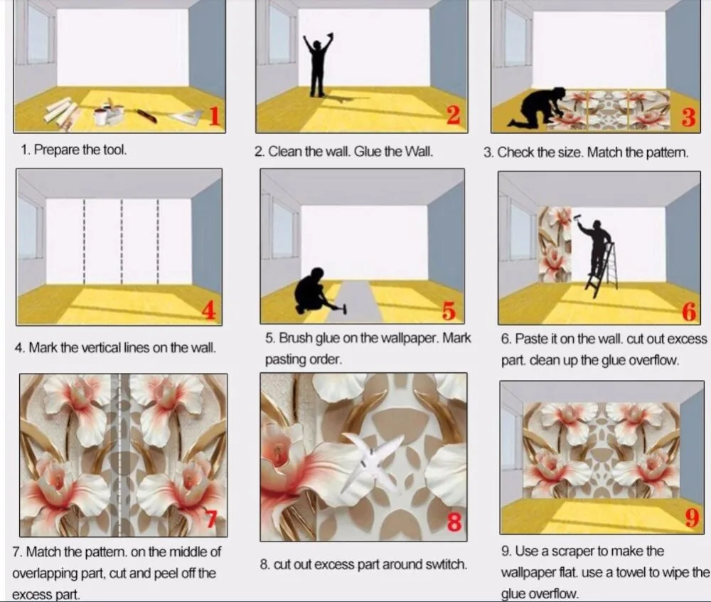При наклеивании второй панели будьте осторожны, чтобы соответствовать рисунку обоев. А в середине перекрывающихся частей Используйте линейку и нож, чтобы отрезать лишнюю часть и снять их.