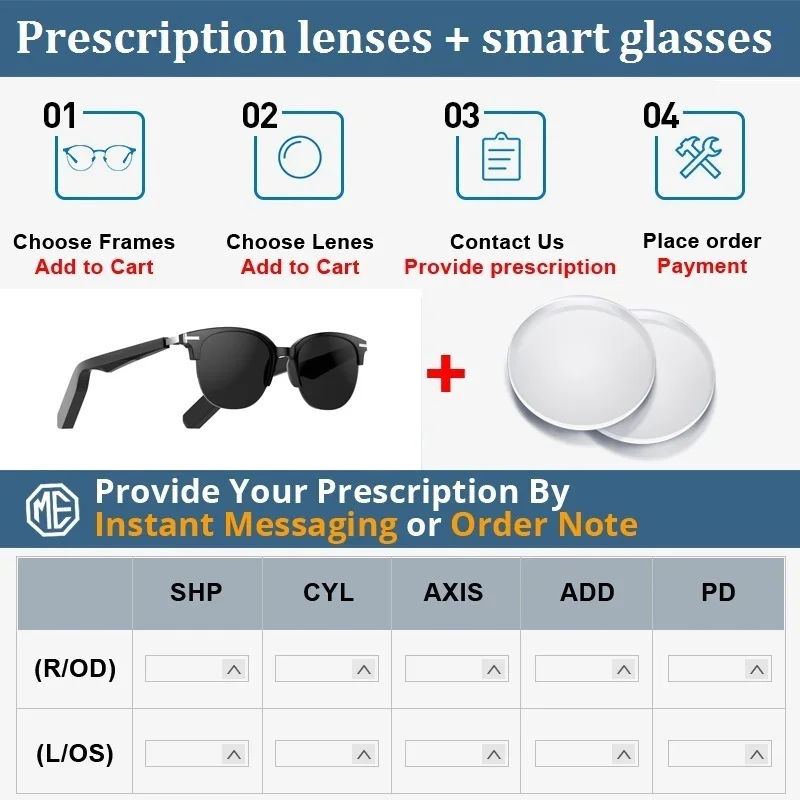 Хорошие новости: мы можем настроить линзы по рецепту/Поляризованные линзы для солнцезащитных очков/линзы пресбиопии и линзы по рецепту обесцвечивания для этих умных очков. Если вам они нужны, пожалуйста, нажмите на ссылку ниже, чтобы узнать и заказать линзы по рецепту, и обратите внимание на свой список рецептов в заказе, или оставьте список рецептов нашему персоналу службы поддержки клиентов