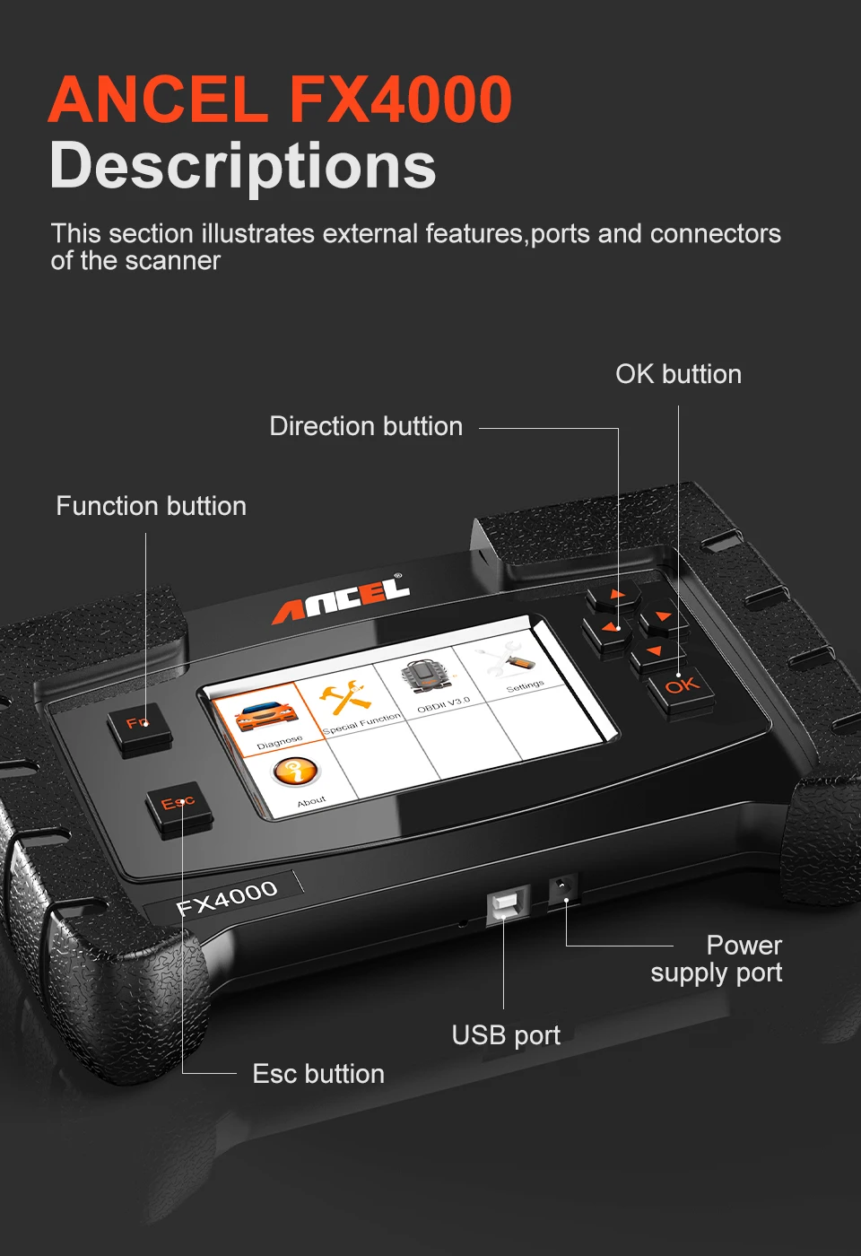 【Полная система для большинства Cars】 ANCEL FX4000 диагностический сканирующий инструмент предназначен для диагностики и очистки кодов неисправностей всех доступных систем, включая двигатель, трансмиссию, ABS, SRS (подушка безопасности), Immo, автомобильное аудио, фары, 4WD, SAS и многое другое! Это профессиональный диагностический сканирующий инструмент, специально разработанный для большинства транспортных средств после 1996 года и ремонтного магазина.