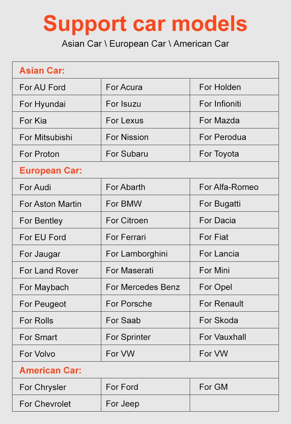Для Audi, для Abarth, для Alfa-Romeo, для Aston Martin, для BMW, для Bugatti, для Bentley, для Citroen, для Dacia, для EU Ford, для Ferrari, для Fiat, для Jaguar, для Lamborghini, для Lancia, для Land Rover, для Maserati, для Mini, для Maybach, Для Mercedes Benz, для Opel, для Peugeot, для Porsche, для Renault, для Rolls, для Saab, для Seat, для Skoda, для Smart, для Sprinter, для Vauxhall, для Volvo, для VW