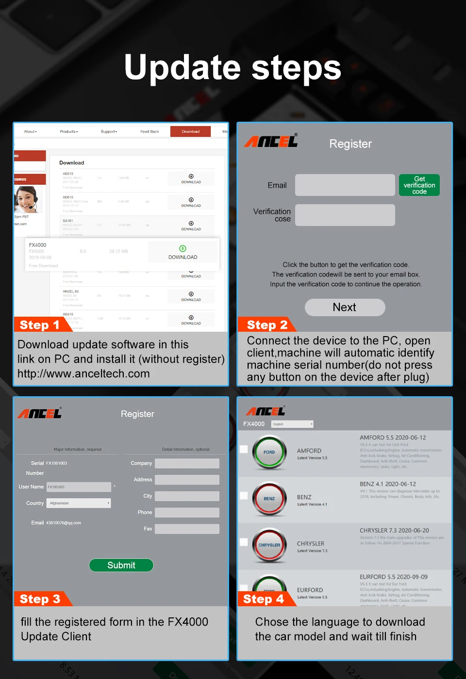 【Lifetime Free Update】 обеспечивает Пожизненное бесплатное обновление программного обеспечения, просто скачайте программное обеспечение с веб-сайта ANCEL. Перед началом обновления, пожалуйста, выполните следующие действия: 1. Подключите это устройство к компьютеру через usb-кабель (только операционная система WIN XP, 7, 8, 10).2. Загрузите новейшее программное обеспечение и установите его на ПК, а затем Откройте программное средство для обновления устройства.