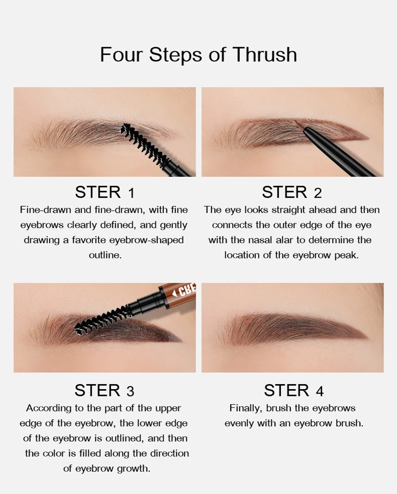 Наконечник ручки продукта имеет форму карандаша, которая может лучше нарисовать форму бровей, которую вы хотите, и спиральная кисть для бровей может лучше расчесывать брови и форму бровей.