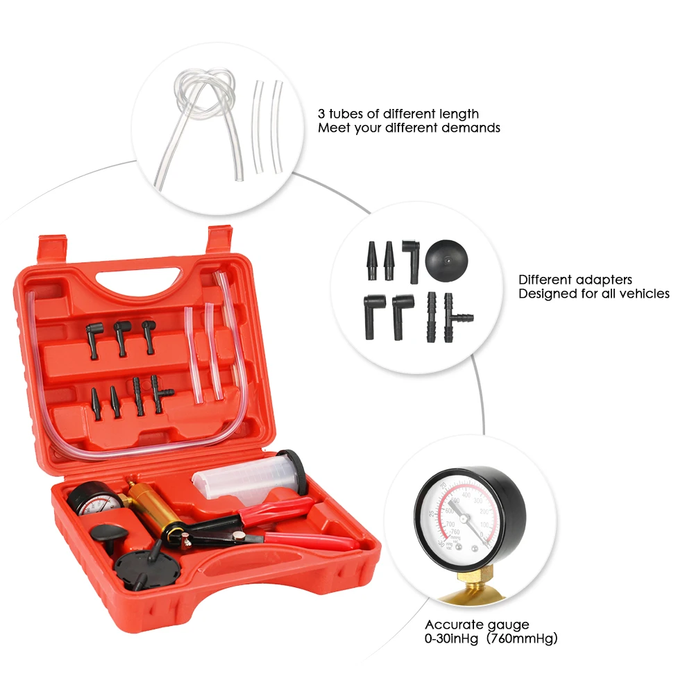 Этот профессиональный вакуумный насос используется для тестирования различных основных параметров и операций транспортного средства. Он может проверить вакуумные и напорные автомобильные компоненты. В комплект входит резервуар тормозной жидкости для кровотечения.