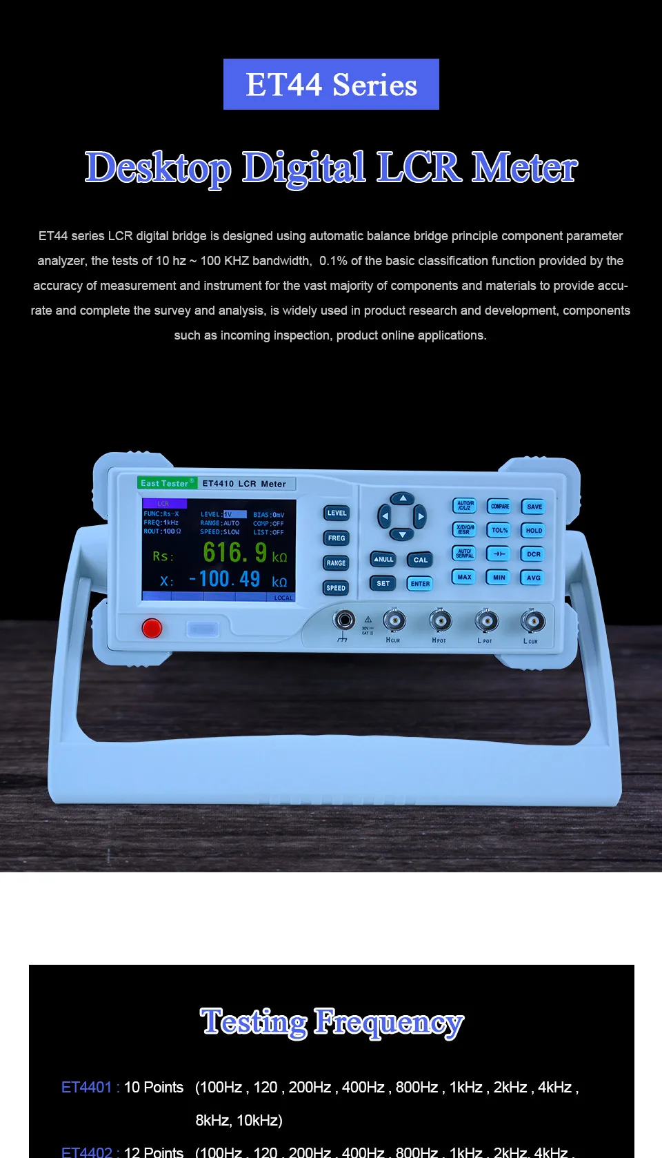 ET44series LCR Цифровой мост разработан с использованием автоматического баланса мост принцип компонентный анализатор параметров, испытания 10 Гц ~ 100 кГц полосы пропускания, 0.1% основной классификационной функции, обеспечиваемой точностью измерений и инструментом для подавляющего большинства компонентов и материалов для обеспечения точной и полной съемки и анализа, Широко используется в исследованиях и разработках продуктов, таких компонентов, как входящий осмотр, онлайн-приложения продукта.