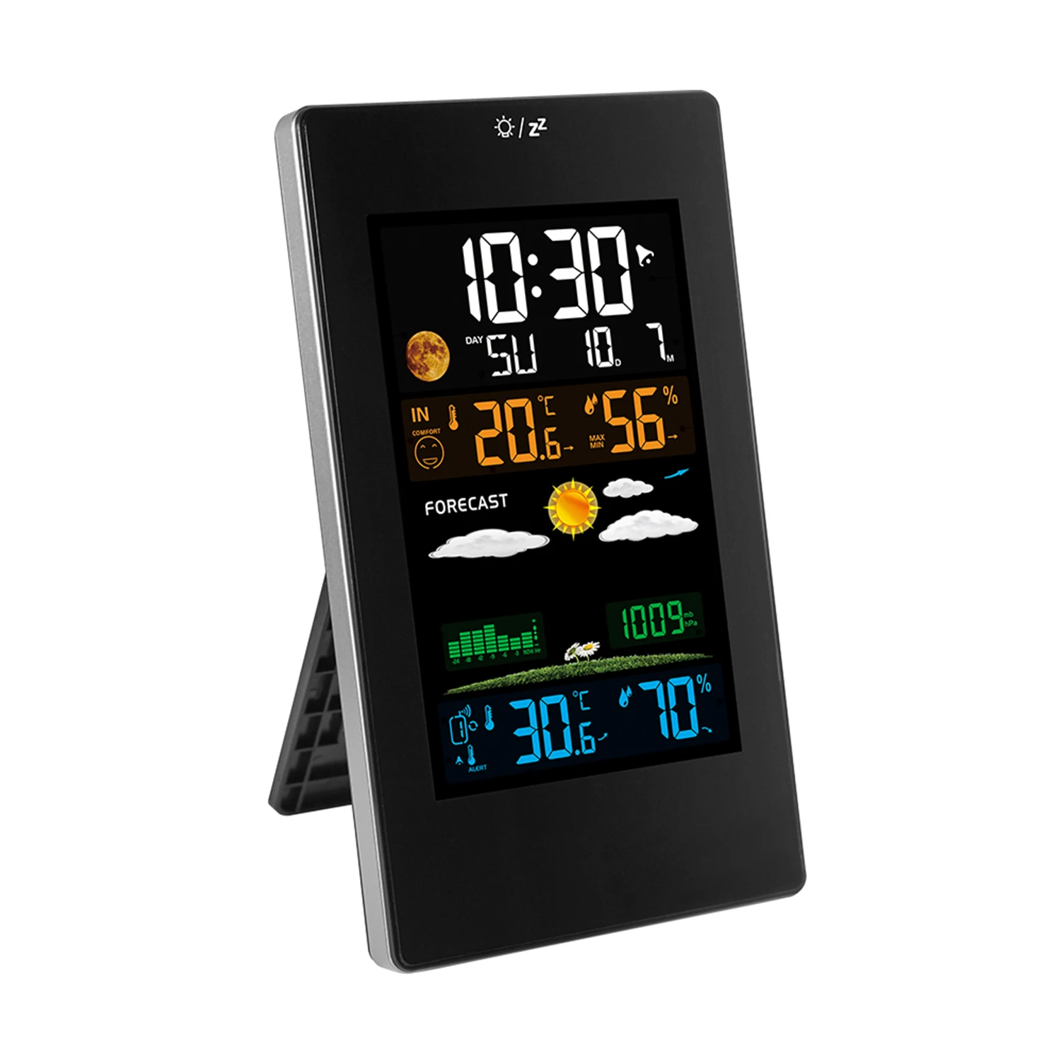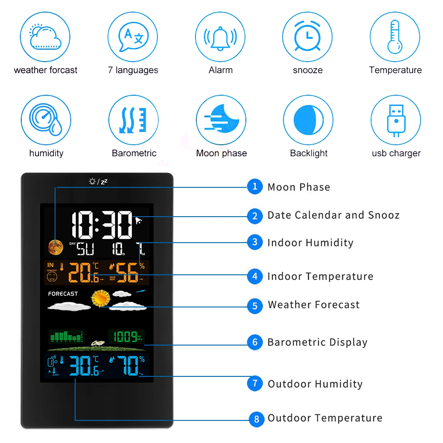 Versatile Weather Station -- 4 level backlight LCD screen to display more information that you demands: Indoor/outdoor temperature and humidity(max/min), customize temperature and humidity (hi/lo) alerts, time/date(7 language), alarm clock/snooze(extra 5-minute sleep), vivid weather forecast, moon phases, barometric pressure trend and 5 comfort level.