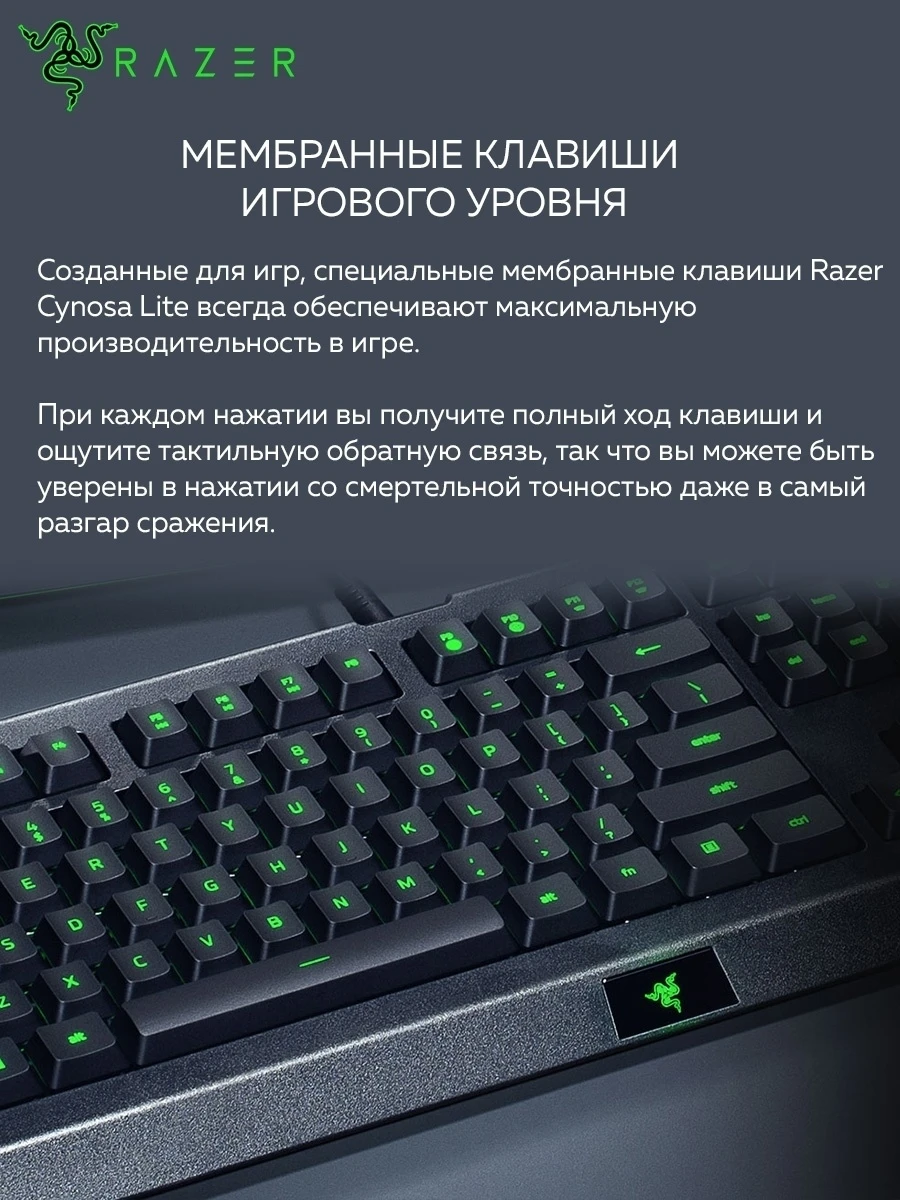 Razer Cynosa Lite обладает бесшумными и мягкими клавишами, обеспечивая тактильный отклик и комфортную игру. Благодаря приложению Razer Synapse 3 клавишам клавиатуры можно записать различные макросы, а также выбрать один из режимов подсветки. Проводное подключение гарантирует стабильную и четкую работу без каких-либо задержек.