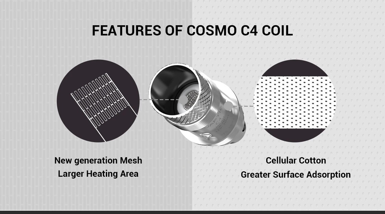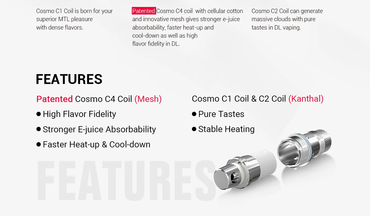 Cosmo C1 coil (Kanthal, 1.6Ω,10-15W) рождается для вашего превосходного удовольствия от MTL с плотными вкусами. Cosmo C2 coil (Kanthal, 0.7Ω,15-23 Вт) может генерировать массивные облака с чистым вкусом При парении DL. Запатентованная Cosmo C4 катушка (сетка, 0,7Ω, 10-20 Вт) с клетчатым хлопком и инновационной сеткой обеспечивает более высокую впитываемость электронных соков, более Быстрое нагревание и охлаждение, а также высокая точность вкуса в DL.