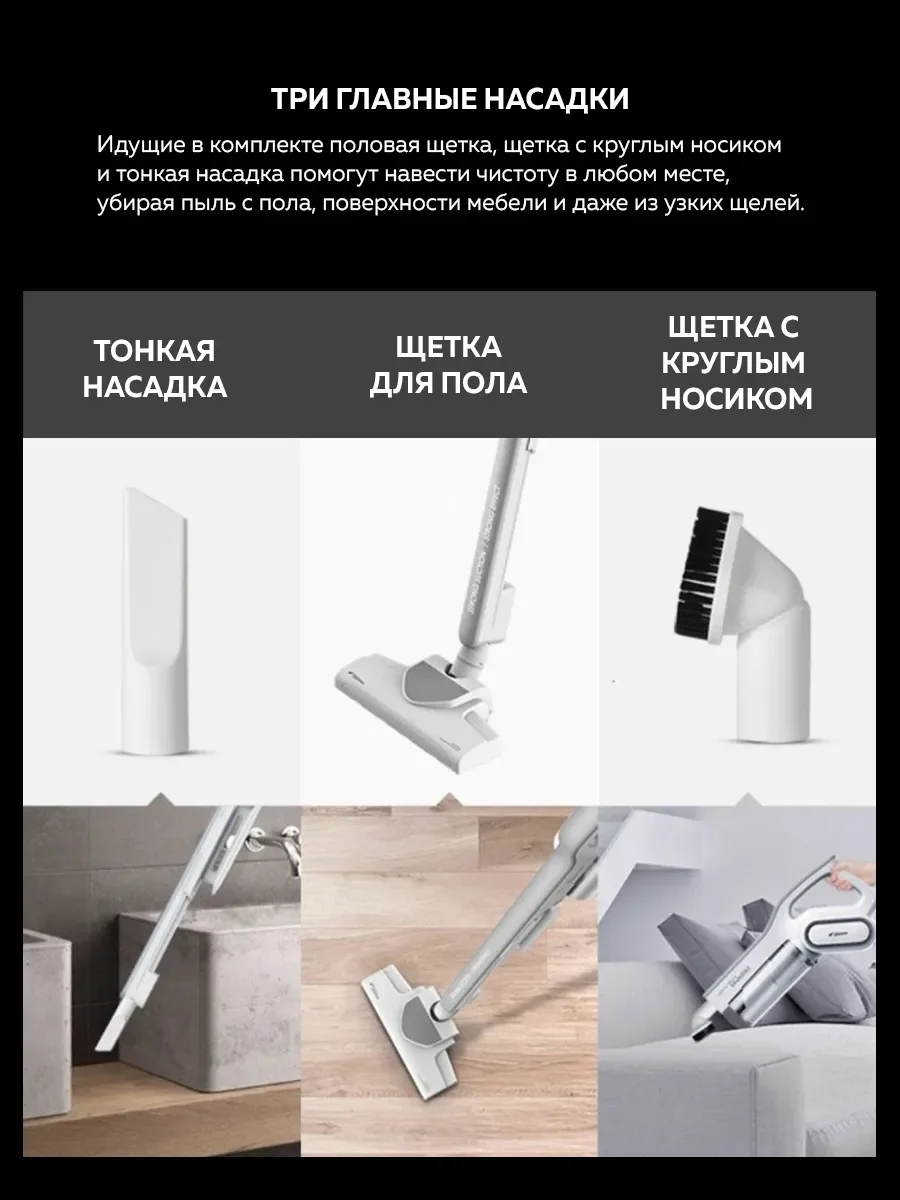 Насадки в комплекте: для пола, для мебели, щелевая