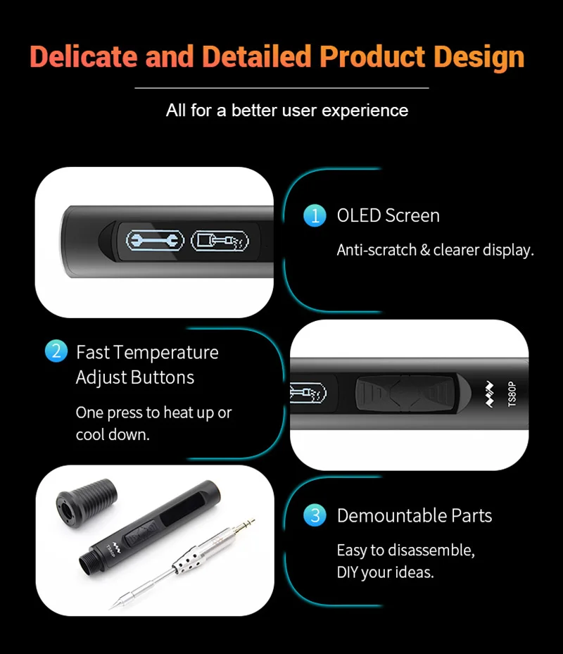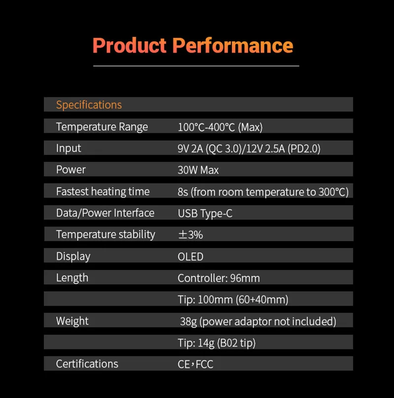 TS80P-это усовершенствованная версия паяльника TS80 smart. TS80P-это умный Электрический паяльник, который использует интерфейс USB Type-C и стандартный источник питания PD2.0 / QC3.0. Можно использовать зарядную головку и зарядку, соответствующие стандарту PD2.0 (12 В 2,5a) или QC3.0 (9 в 2A). Baohe мобильный источник питания, выходная мощность до 30 Вт. Нагрев от комнатной температуры до 300 ° C занимает всего 8 секунд быстрее, и производительность выше. Корпус контрольного терминала TS80P изготовлен из алюминиевого сплава и интегрирован с ЧПУ. Конструкция компактная, эргономичная, красивая и модная и имеет чувство технологии. Оснащенный oled-дисплеем, вам удобно контролировать состояние паяльника в любое время. Встроенный STM32 интеллектуальный чип управления, который может разумно контролировать повышение и падение температуры, с несколькими режимами, такими как сон, автоматическое отключение, защита безопасности и т. д. Слой приложения кода является открытым исходным кодом, вы можете разработать прошивку паяльника в соответствии с вашими потребностями. TS80P и TS80 имеют паяльную головку, в которой используется керамический нагревательный сердечник с внутренним подогревом. Благодаря теплопроводящей части из чистой меди тепло быстро переносится на наконечник головки паяльника, а показатели контроля температуры стабильны. Материал корпуса: алюминиевый сплав Обработка оболочки: Анодное окисление Вход элемент питания: 9V/2A(QC 3,0)/ 12V 2.5A(PD2.0) Диапазон температур: 100 ℃-400 ℃ (макс.) Максимальная скорость нагрева: 8s (комнатный Temp-300 ℃) Порт подключения: USB Type-C Дисплей: дисплей на органических светодиодах (OLED) Экран Мощность: 30 Вт Длина ручки: 96 мм Длина наконечника припоя: 100 мм (60 мм + 40 мм) Вес ручки: 38 г Вес наконечника припоя: около 15 г Устойчивость к заземлению:< 2Ω Сертификация: CE,FCC,PSE Функции: Защита порта; Режим сна; Автоматическое отключение питания; Настройка пускового логотипа; Обновление прошивки; Слой приложения с открытым исходным кодом Посылка включает в себя: 1 комплект паяльника TS80 Plus