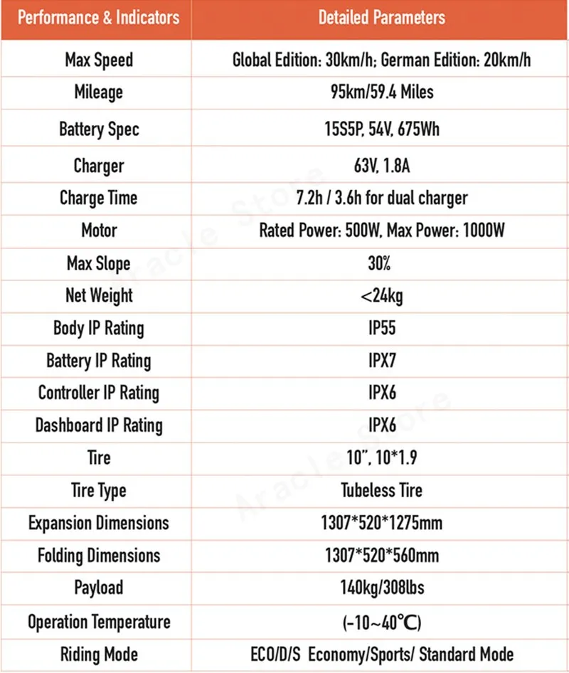 Продукт: INMOTION L9 Подходящий возраст: более 14 лет Максимальная скорость: 18,6 миль/ч/30 км/ч Вес нетто: 24 кг Макс. Пробег: до 95 км Аккумулятор: 675Wh Размер шин: 10*1,9 дюймов Макс. Наклон: до 30 ° Максимальный вес драйвера: 140 кг Водонепроницаемость: IPX7 Режимы езды: ECO/D/S Economy/Sports/ Standard Mode Макс. Время зарядки: 7,2 ч (одно зарядное устройство)/3,6 h (зарядное устройство) Размеры расширения: 1307*520*1275 мм Размеры складывания: 1307*520*560 мм
