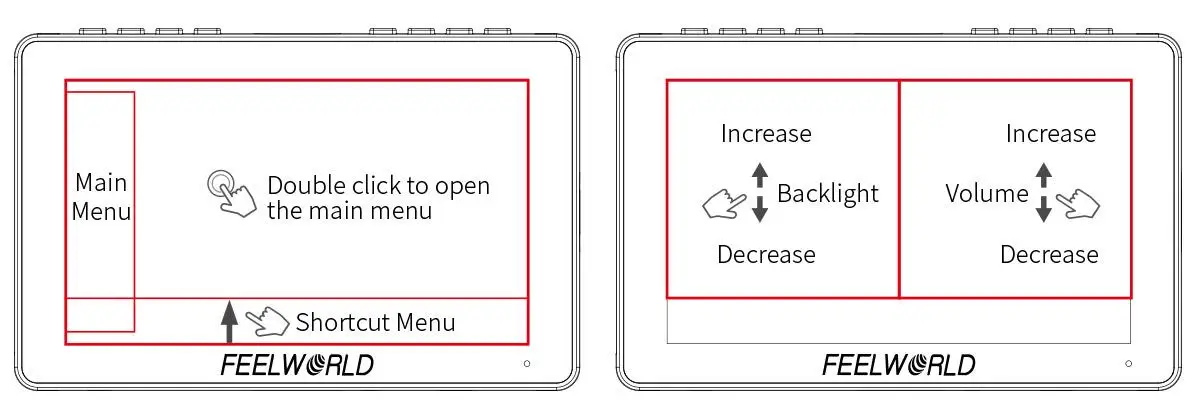 1. Когда монитор и касание включены, непрерывно нажимайте на экран дважды, чтобы войти в главное меню. 2. Проведите пальцем вверх в нижней части экрана, чтобы открыть меню быстрого доступа и нажмите на соответствующее меню, чтобы открыть или установить соответствующую функцию. Дважды нажмите на функцию быстрого меню и выберите настройки функции с помощью клавиши «<» или «>». 3. На левой стороне экрана (1/2 сплит-экрана), вы можете непосредственно регулировать яркость подсветки экрана; На правой стороне экрана (1/2 сплит-экрана), вы можете напрямую регулировать громкость. 4. Нажмите на любое место рядом с меню, чтобы выйти из меню.