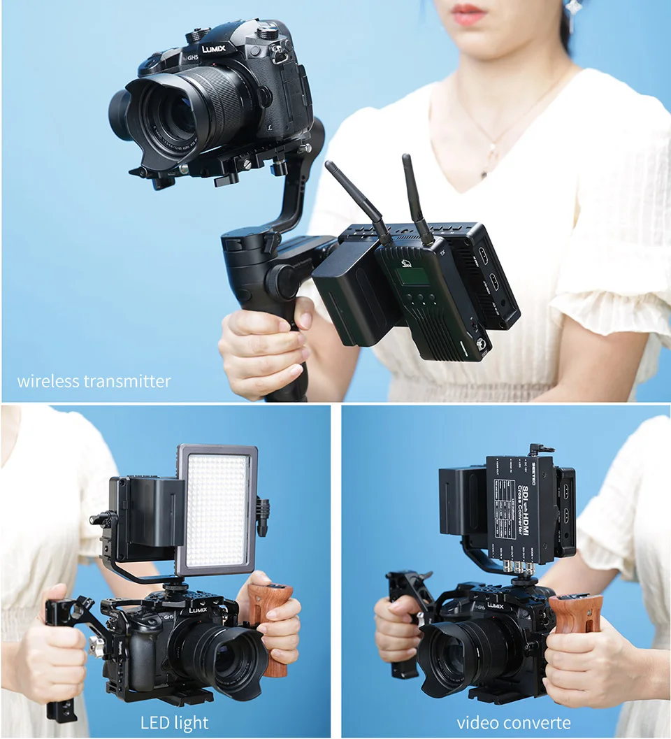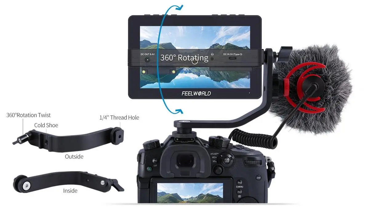 F5 Pro V2 имеет стандартные точки крепления 1/4 "(сверху, снизу, справа, средней задней части) для крепления к камерам и установкам. Вы можете не только установить его на монитор с помощью рычага наклона, но и установить его на Ручной Стабилизатор или надежно прикрепить его к верхней части камеры в качестве конечного видоискателя HD! Если вы установите его в нижней части устройства, вы также можете объединить функцию переворачивания изображения для поддержания правильной ориентации экрана!