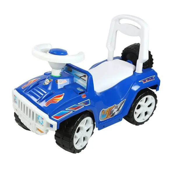 Машинка-каталка предназначена для детей от 3-х лет. Максимальная нагрузка — 30 кг. Размер каталки: 640x305x390 мм. Высота до сидения 23 см. Мини джип в ярких цветах и на широких колесах – такое авто имеет массу поклонников. Кроме того, руль оборудован клаксоном почти как у настоящей большой машины. А под сидением предусмотрено место для игрушек, которые очень хочется взять с собой. Машина изготовлена из пластмассы. Каталка имеет устойчивую конструкцию. Спереди и сзади установлены упоры. Сиденье каталки оснащено спинкой.
