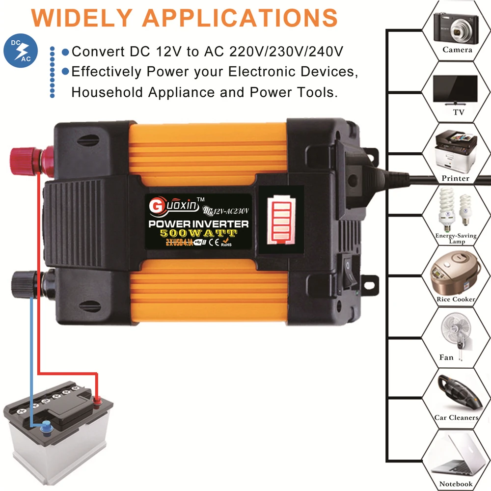 1.Это модифицированный синусоидальный инвертор, не подходит для устройств, которые работают со встроенным мотором, фены, кондиционеры, кофемашина, водяной насос, индукционная плита, холодильники и микроволновые печи и т. д. Убедитесь, что общая номинальная мощность подключенных устройств ≤ 400 Вт