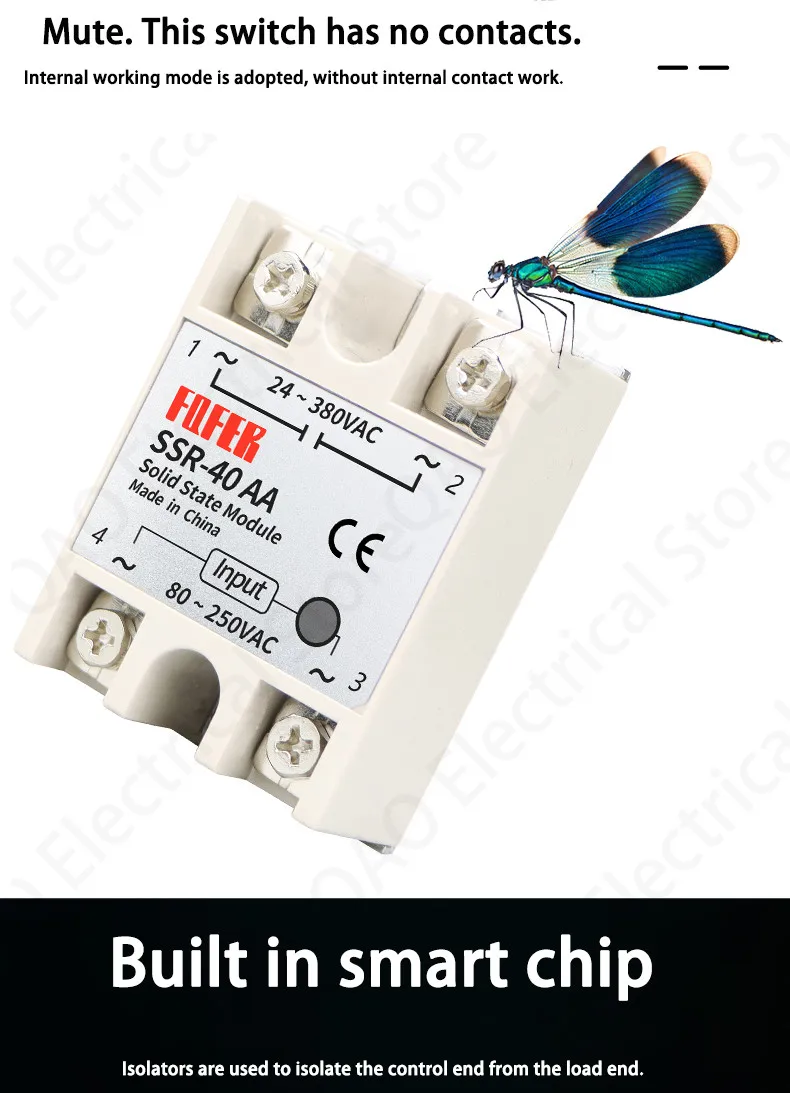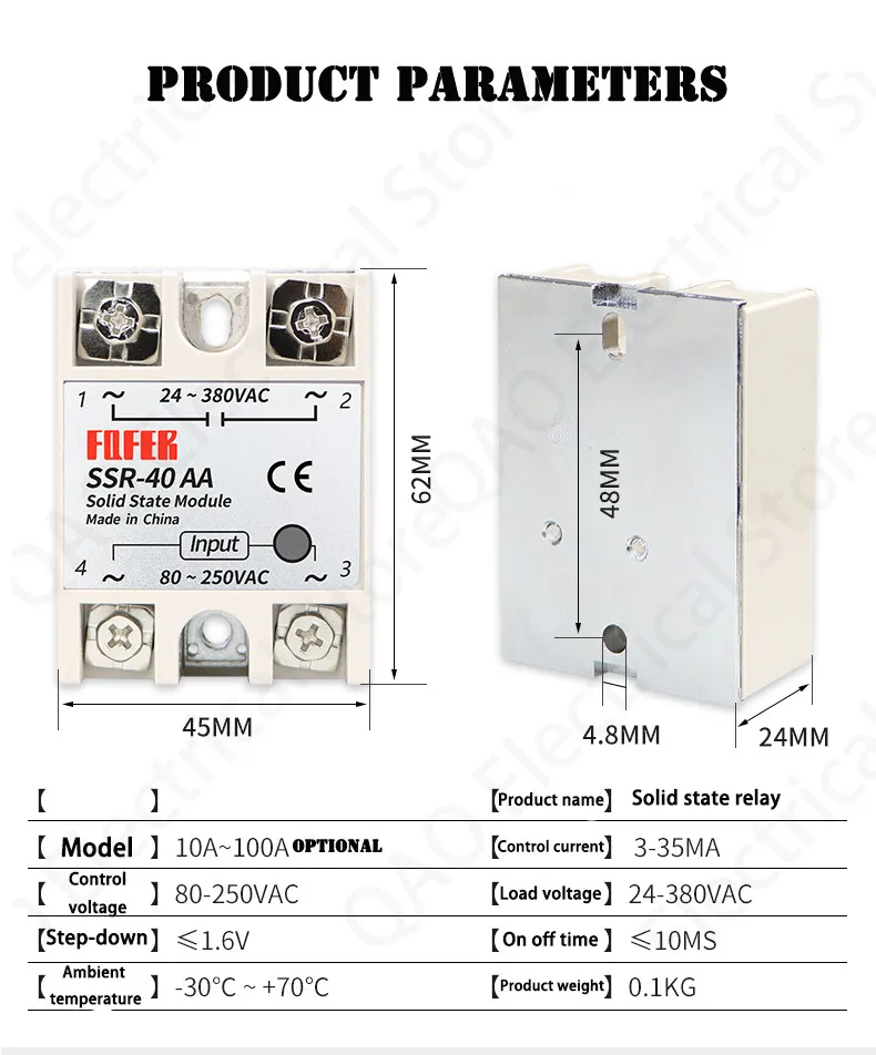 Особенности Подходит для влажной золы и высокой коррозионной стойкости к суровым условиям и случаю частого переключения, вместо электромеханического реле широко используется в цифровом программном устройстве, устройстве контроля температуры, система обработки данных и схема интерфейса компьютерного терминала Спецификация Ток нагрузки: 10A/25A/40A Напряжение нагрузки: 24 ~ 480 В/AC Напряжение управления: 80 ~ 250 В/переменный ток Контрольный ток: постоянный ток:, 3 ~ 25 мА, Переменный ток: 12 мА Инструкция по работе: светодиодный