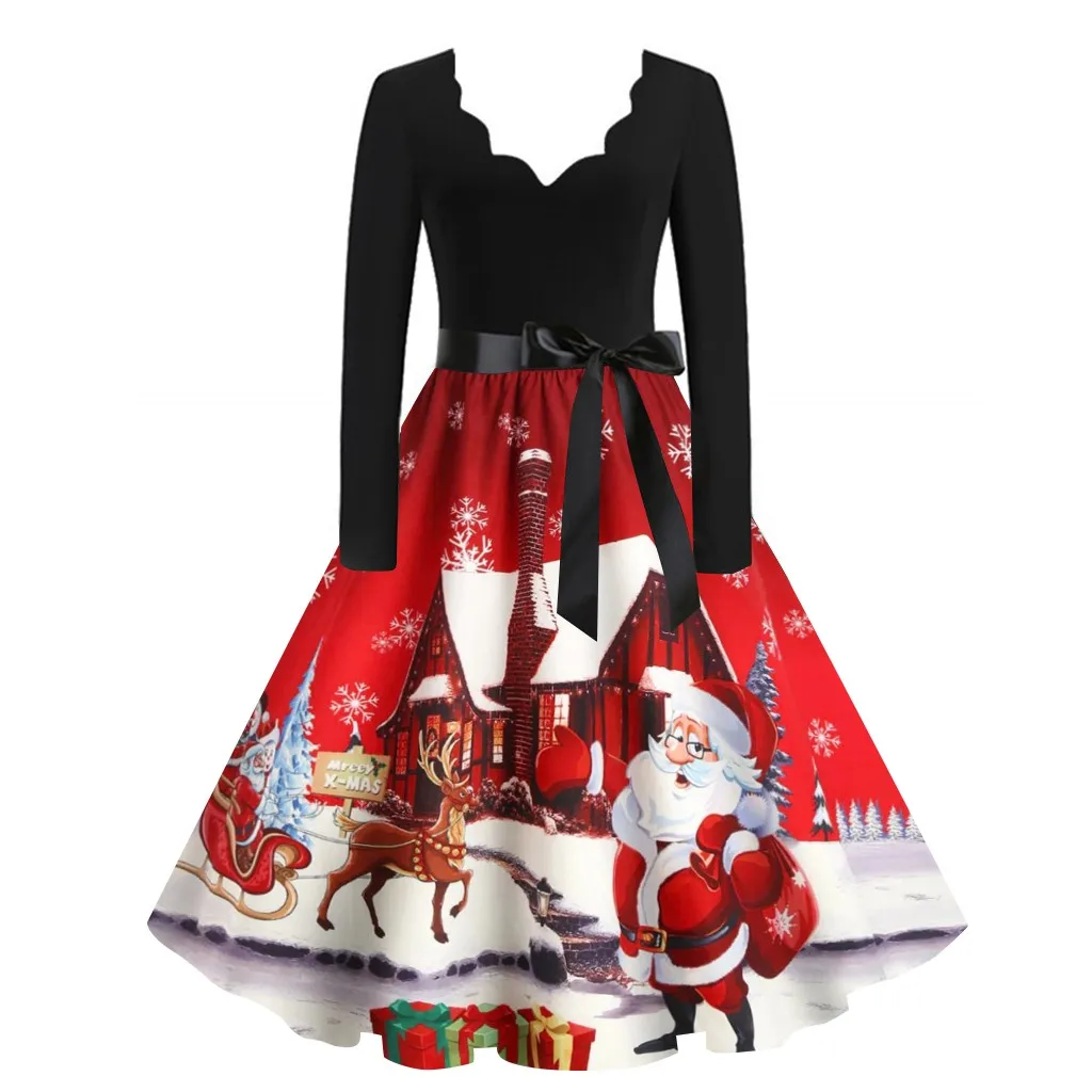 Винтажный вышитый Рождественский принт плюс Европейский королевский стиль придает вам элегантный стиль в стиле ретро; Облегающий и расклешенный силуэт подчеркивает Вашу фигуру