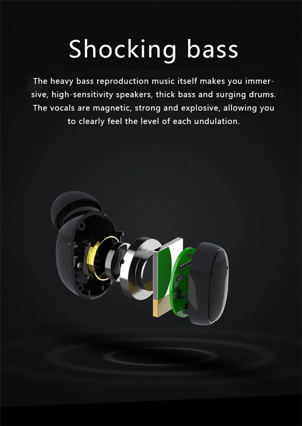 100% Высокое качество и полная истина Пыле-и IPX5 Водонепроницаемый, двойной Ушастый сплит дизайн, одиночные и двойные уши свободно носить. Автоматически подключается, включается после выхода из зарядного устройства на 280 мАч. Настоящая беспроводная гарнитура, разделение левого и правого каналов, автоматическое подключение, оба уха можно использовать отдельно. Одна кнопка управления легко включается/выключается, воспроизводит/паузы/переключает музыку, свободные руки звонки для вождения, работы, встречи, бега. Одно-два подключения, можно подключить к двум мобильным телефонам одновременно. Интеллектуальная Совместимость: поддерживает все мобильный телефон, планшет, ноутбук, музыку QQ, фильмы и т. д., универсальный мобильный телефон. Характеристики: Цвет: черный Время зарядки: около 1-2 часов Время работы в режиме ожидания: около 80 часов Время воспроизведения музыки: около 3 часов Время разговора: около 4 часов Формат передачи аудио: HFP/A2DP/HSP/AVRCP Аккумулятор для наушников: полимерный литиевый аккумулятор 45 мАч Аккумулятор: полимерный литиевый аккумулятор 280 мАч Рабочая Напряжение: 3,2-4,2 V Напряжение зарядки: 5 в пост. Тока Частота: 2,4-2,48 ГГц Сопротивление рога: 32 Полоса пропускания рога: 20-20 кГц Чувствительность рога: 105 дБ Чувствительность микрофона: -42 +/-2 дБ Размер посылка: 103x103x35 мм/4,1x4,1x1,4 дюймов Вес посылка: 110 г Посылка включает в себя: 1 х A6L мини TWS наушники 1 х USB кабель для зарядки 1 x Руководство пользователя