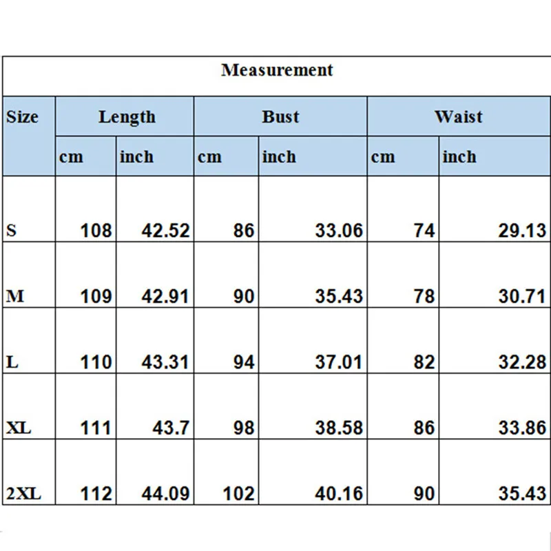 ДлинаТалияБюстS 108 см74 см86 см М 109 см78 см90 см L 110 см82 см94 см XL 111 см86 см98 см 2XL 112См 90 см 102СмСовет: 1. Напоминаем, что из-за световых эффектов, настроек яркости/контрастности монитора и т. д. могут быть некоторые незначительные различия в цветовом тоне фотографии на сайте и фактического товара. 2. Изделие измеряется вручную, оно может отличаться на 1-3 см, ваше понимание будет высоко оценено.