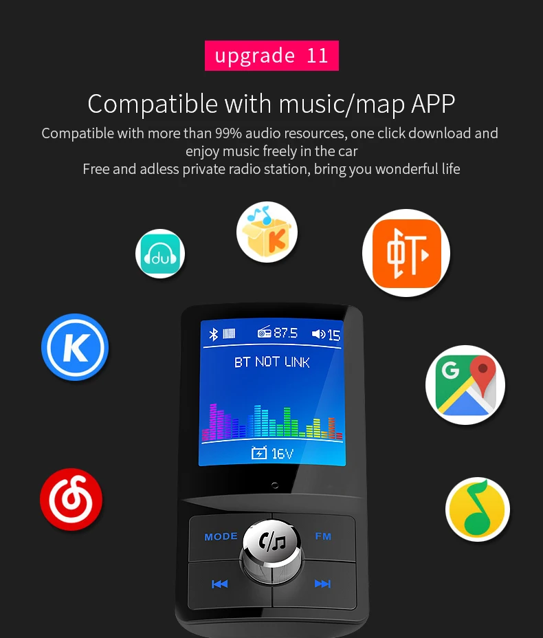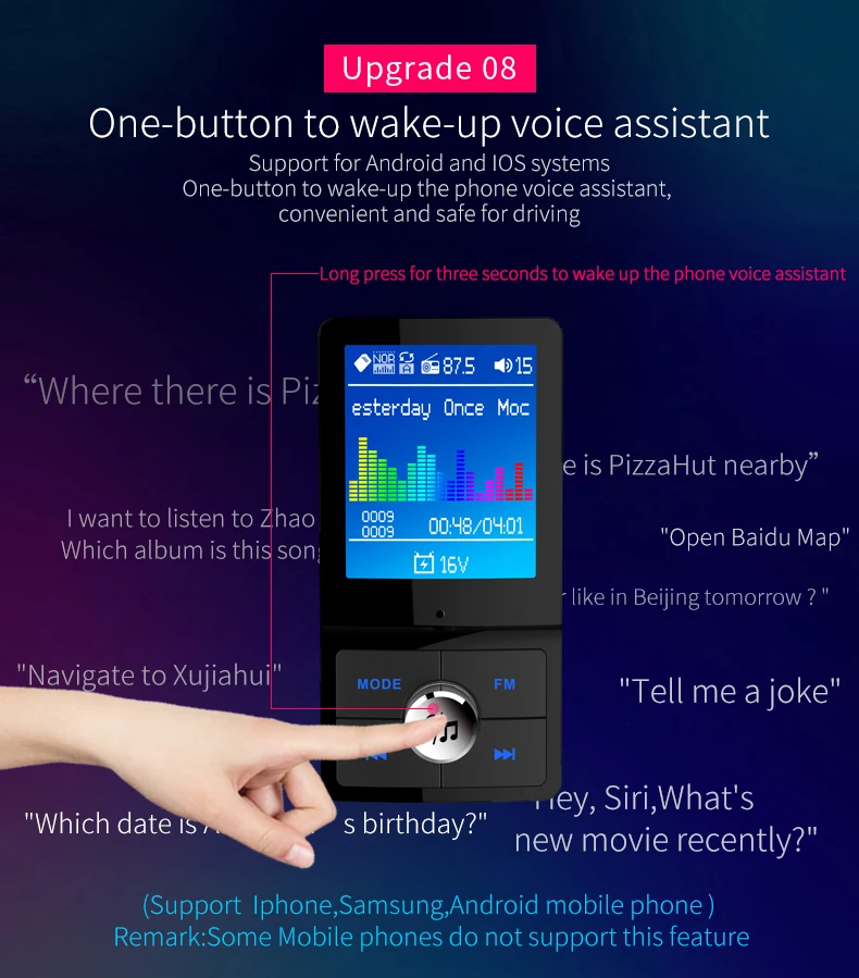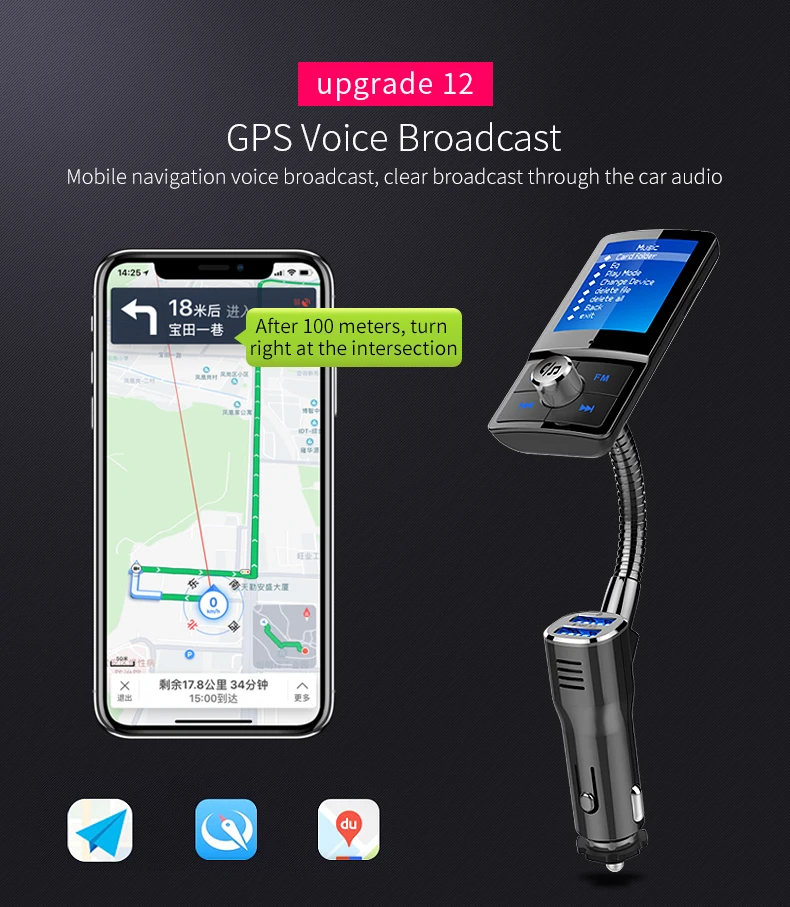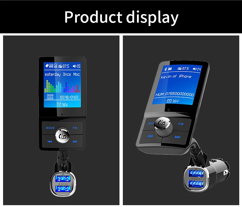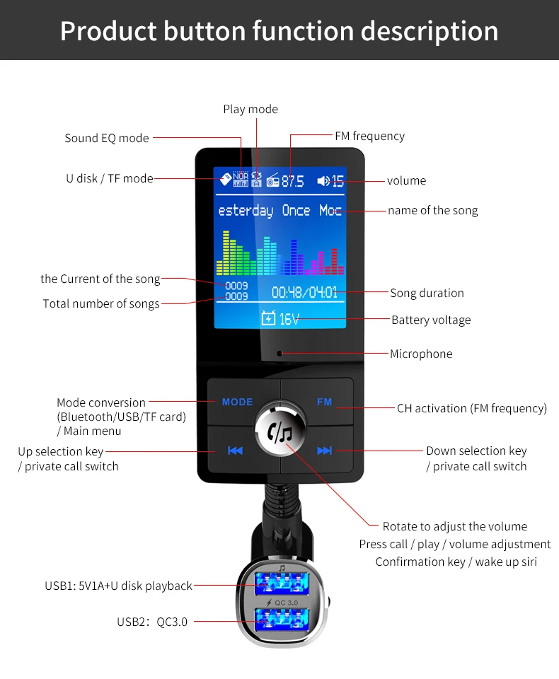 Описание товара: 1. Цветной ЖК-дисплей поддерживается. 2. Автоматическое отключение канала памяти. 3. Поддержка зарядки QC3.0 (USB1 + USB2 всего 4A). 4. Поддержка FM полной частоты 87,5 МГц-108 МГц. 5. Поддерживает usb флэш-диск и tf-карту воспроизведения музыки. 6. Используйте bluetooth для ответа, отклонения, зависания, повторного набора и других функций. 7. Личные переговоры. 8. Поддержка аудиовхода. 9. Поддержка Siri/голосового ассистента. Поддержка выбора воспроизведения папок. 11. Обнаружение напряжения аккумулятора в режиме реального времени. 12. Поддержка китайского, английского, японского, корейского, французского, немецкого, итальянского, испанского и т. д.