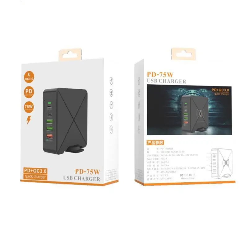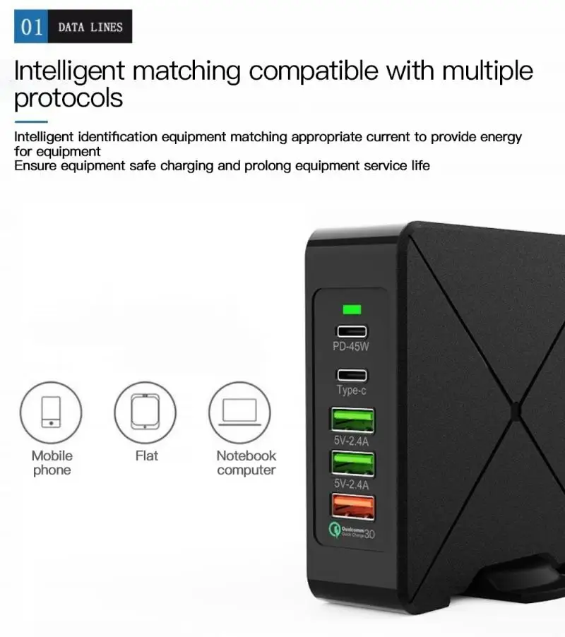 Быстрое зарядное устройство имеет слот для PD-45W, разъем типа c, два usb-разъема и разъем для быстрой зарядки, может быть достаточно различных потребностей интерфейса зарядного кабеля и одновременной зарядки различных цифровых устройств.