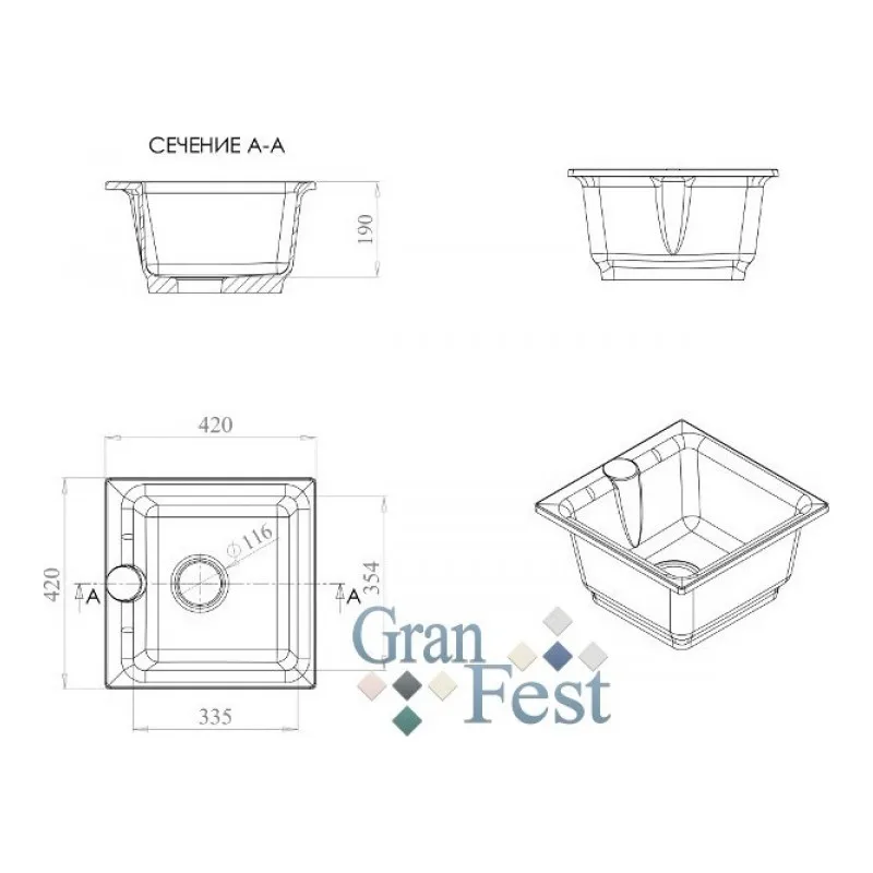 Подходит для установки на шкаф шириной 40 см Размер основной чаши мойки: 345x322x190 мм Расположение переливного отверстия: в чаше мойки Установочный проём: 397x397 мм Размер упаковки: 560x560x280 мм GranFest сегодня - это высокотехнологичный современный производственный комплекс с постоянно растущим объемом производства.
