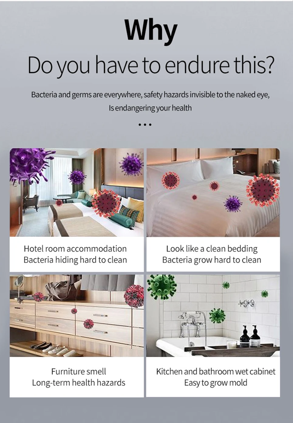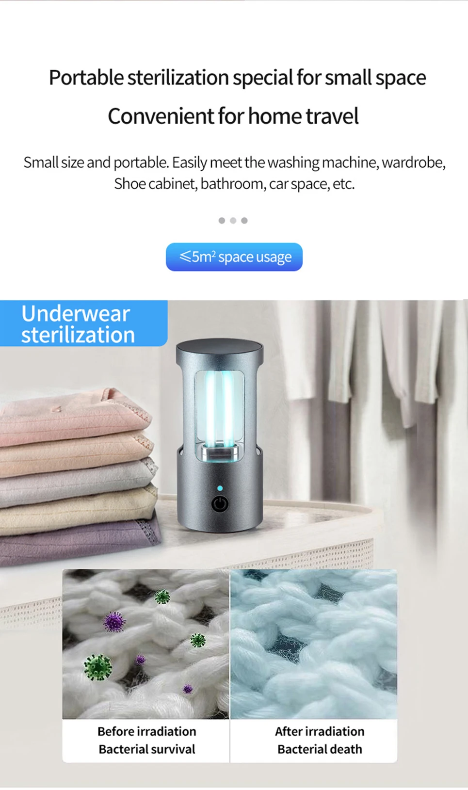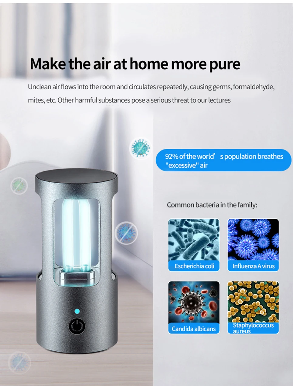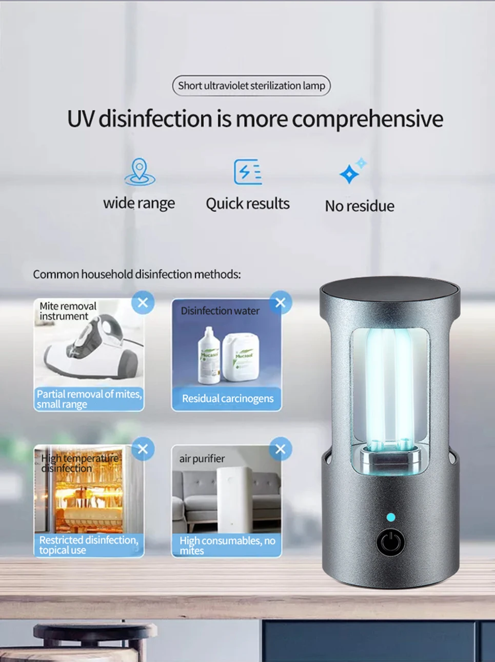 1. Пылезащитные клещи: пылевые клещи-это крошечные создания, которые невидимы невооруженным глазом, на кровати, подушке, диване, ковре, они повсюду в доме и причиняют много вреда: пылевые клещи укусывают кожу людей, делают зуд и покраснение кожи, позволяют людям не спать и не чувствовать дискомфорта. UV-C лучи этой лампы намного прочнее солнечного света, они могут немедленно убить пылевые клещи.