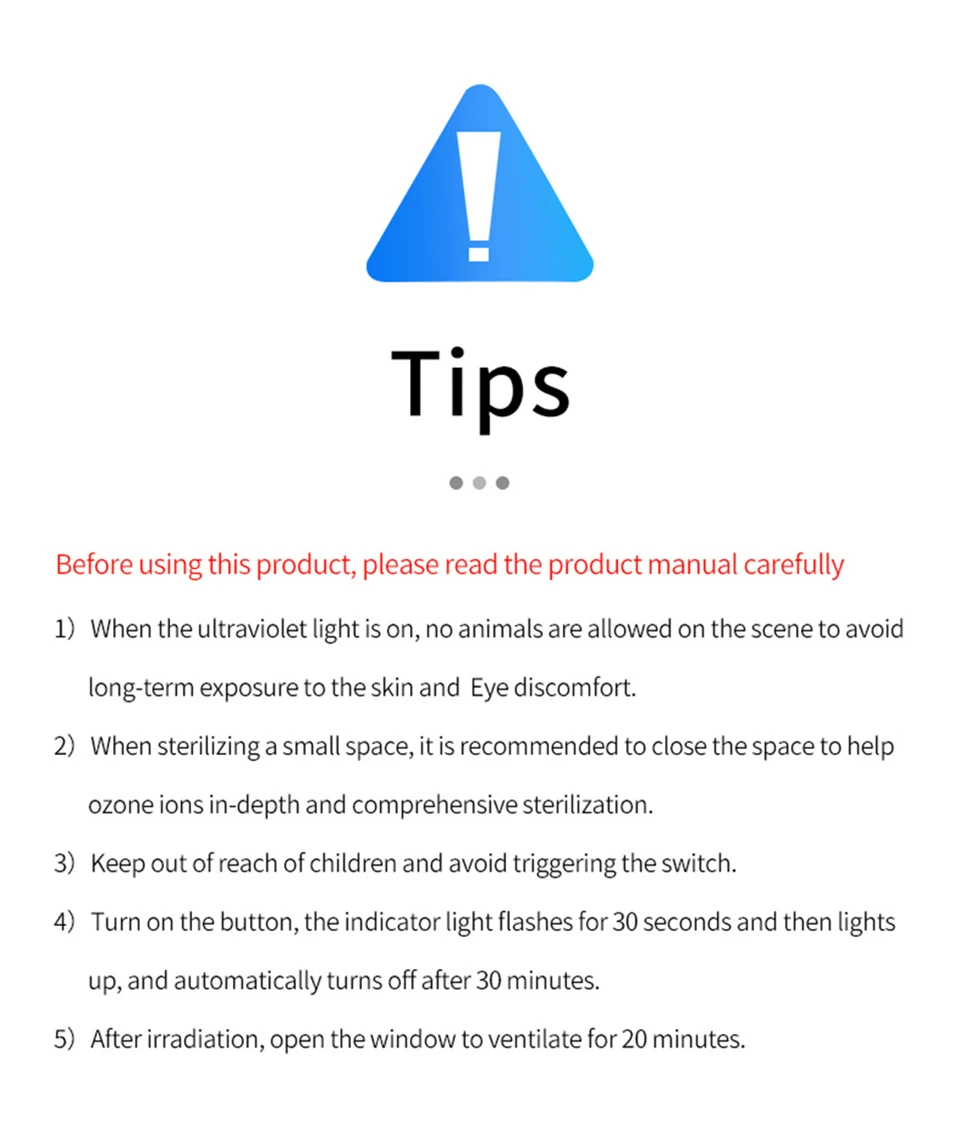 1. UVC луч и озон вредны для глаз и кожи человека. Пожалуйста, держитесь подальше от него, когда он работает.