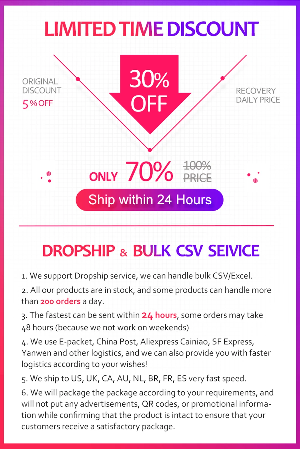 Вопросы и ответы В: есть ли скидка на крупные заказы? О: если вы разместите большой заказ с нами в течение определенного периода времени, мы отправим товары вместе и предоставим Вам скидку. В: Поддерживаете ли вы другие варианты доставки? О: Да, мы предоставляем Почта Китая обычный маленький пакет плюс, Cainiao Super Economy, ePacket, AliExpress Стандартная доставка и Почта Китая заказной авиапочтой В: все фотографии настоящие? О: Конечно, все наши изображения на 100% сделаны нашими фотографами В: Поддерживаете ли вы прямую доставку? О: Да, мы поддерживаем прямую доставку. Вам нужно только подтвердить информацию В: почему логистика такая медленная? Ответ: на самом деле, это не так быстро, как DHL fedex, потому что все наши продукты являются низкими маржи и бесплатная доставка для большинства стран, который представляет собой потери для некоторых стран, честно говоря, но я считаю, что логистика не медленная и может отслеживать, куда идет информация. Отгрузка 1. После вашей оплаты, из-за ситуации с запасами и разницы во времени, мы выберем доставку ваших товаров с нашего первого доступного склада для быстрой доставки, мы тщательно подготовим товары для вас в течение 1-5 дней. Вообще говоря, срок доставки составляет около 5-60 дней, и даже больше для кораблей из отдаленных или слаборазвитых стран. 2. Мы отправляем только на подтвержденный адрес заказа. Ваш адрес заказа должен совпадать с адресом доставки. 3. Время перевозки осуществляется перевозчиком, за исключением выходных и праздничных дней. Время доставки может меняться, особенно во время праздников. 4. Информация об отслеживании будет предоставлена в течение 2-5 дней после отгрузки (некоторые бесплатные логистики не имеют информации об отслеживании). Если вы все еще не получили товар, когда дата доставки подходит к концу, пожалуйста, свяжитесь с нами, чтобы продлить дату доставки для вас. 5. Если вы не получили товар в течение 60 дней после оплаты, пожалуйста, свяжитесь с нами. Мы Отследим доставку и свяжемся с Вами как можно скорее. Наша цель – удовлетворение клиентов! Возмещение средств 1. После получения товара, если вы обнаружите какие-либо проблемы с товаром, пожалуйста, немедленно свяжитесь с нами и предоставьте нам достаточно доказательств. (Совет: при открытии посылка запишите незапечатанное видео.) Если продукт действительно поврежден, пожалуйста, сделайте фотографию и отправьте его на нашу электронную почту или онлайн-чат, чтобы связаться с нами. Мы предоставим Вам решения или компенсацию. 2. У вас есть 7 дней, чтобы связаться с нами и вернуть товар через 15 дней после получения. Если у вас есть товар более 7 дней, вы подумаете о его использовании, и Мы не дадим вам возврат или замену. 3. Все возвращенные товары должны быть в оригинальной посылка, и вы должны предоставить нам номер отслеживания доставки, конкретную причину возврата и ID вашего заказа. 4. После получения оригинала и упаковки возвращенных товаров со всеми компонентами и аксессуарами, мы вернем вам полную сумму покупки. 5. Если товар прибудет на ваше место и вы не заберете его, он будет возвращен нам. После получения товара, мы вернем или повторно отправим его вам по запросу (вы будете нести ответственность за возврат и почтовый сбор). Отзывы Отзывы 1. Если вы удовлетворены нашей продукцией, Мы будем признательны за ваши отзывы с пятью звездами. Мы дад