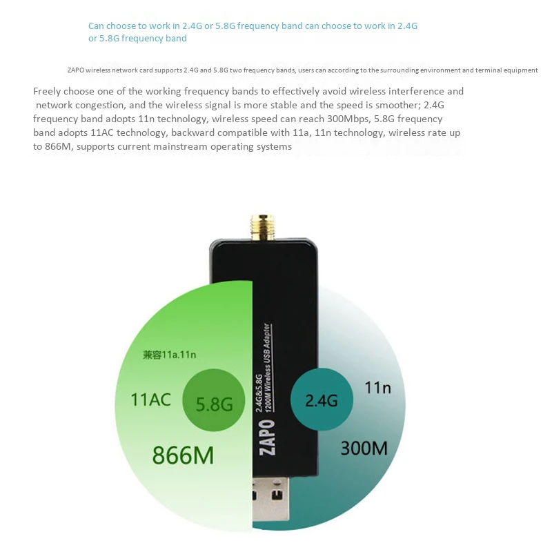 2. В то же время, он поддерживает сеть 2,4 ГГц и 5,8 ГГц. Сигнал диапазона 5,8 ГГц шире, скорость передачи быстрее, а способность анти-помех сильнее, что подходит для беспроводного видео и игры. Совместимость 2.4GH для старого оборудования прочнее