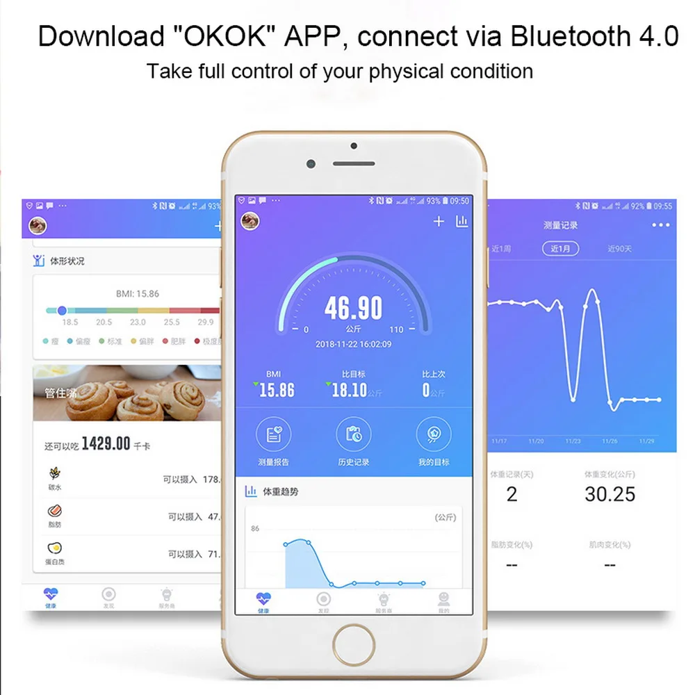 -Синхронизация с приложением для фитнеса-умные весы для тела с простой операцией, просто загрузите приложение «OKOK», подключите через Bluetooth 4,0.
