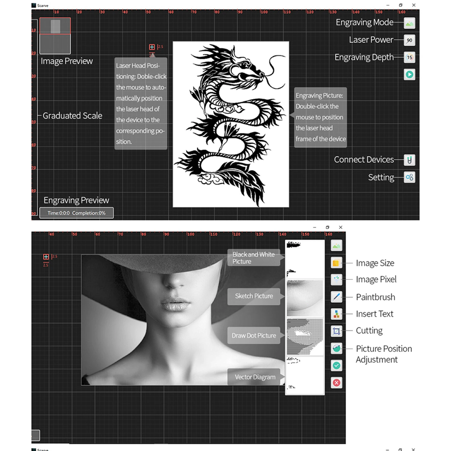 Режим гравировки: гравировка изображения, резьба по тексту, контурная резьба, резьба по пикселям