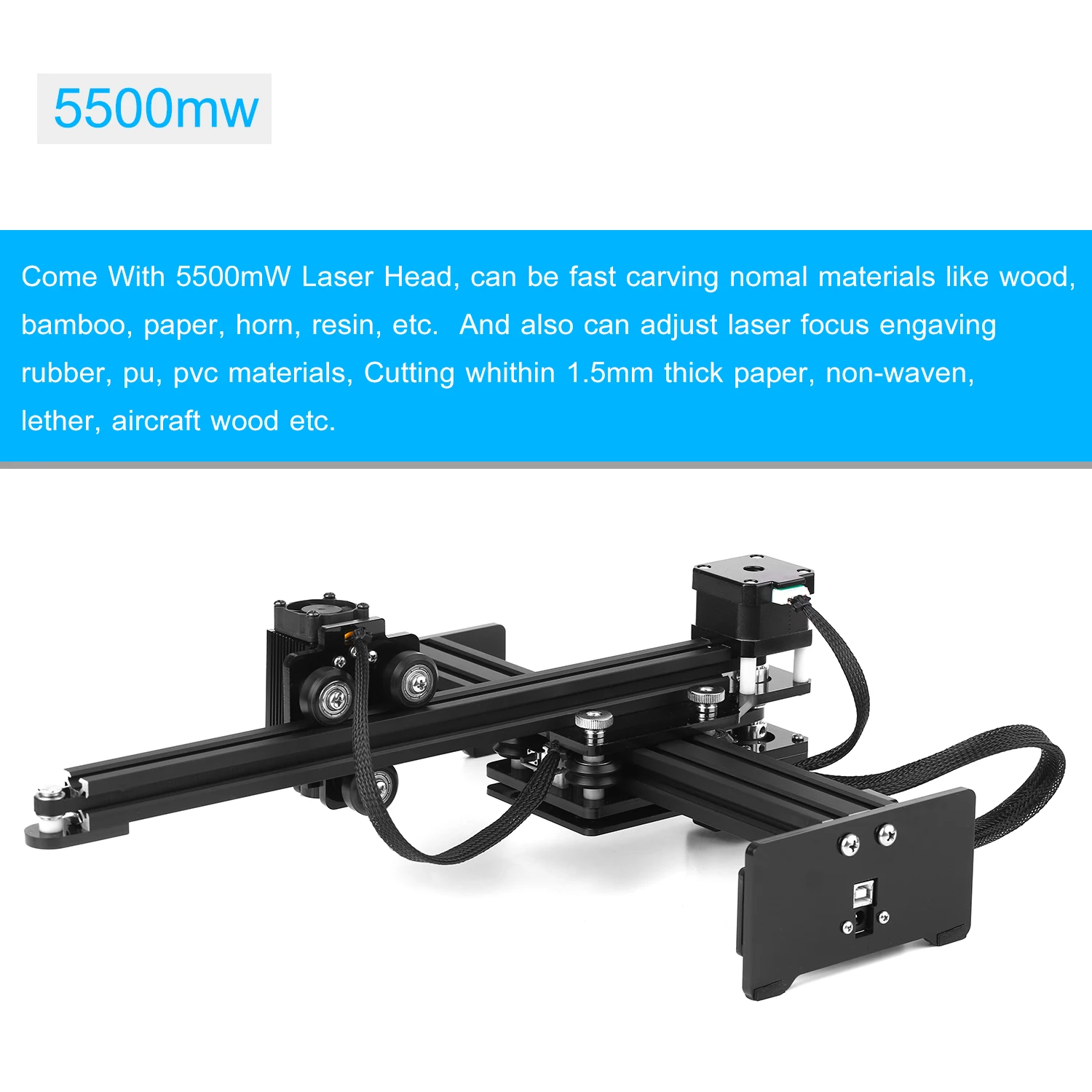 Поставляется с лазерной головкой мощностью 5500 МВт, может быть быстро резьба по номинальным материалам, таким как дерево, бамбук, бумага, рог, смола и т. д. А также может регулировать лазерный фокус, омолаживающий резину, ПУ, ПВХ материалы, резка белой толщиной 1,5 мм бумаги, неволновой, кожаной, древесины самолетов и т. д.