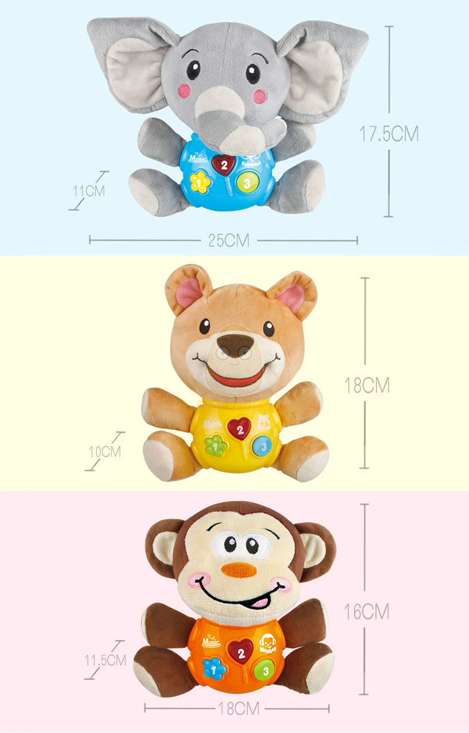 1. Такие мягкие и приятные эти очаровательные звуковые куклы изготовлены из супер мягкого плюша, который отлично себя ощущает на ощупь. 2. Нажмите эту кнопку, чтобы воспроизвести музыку.