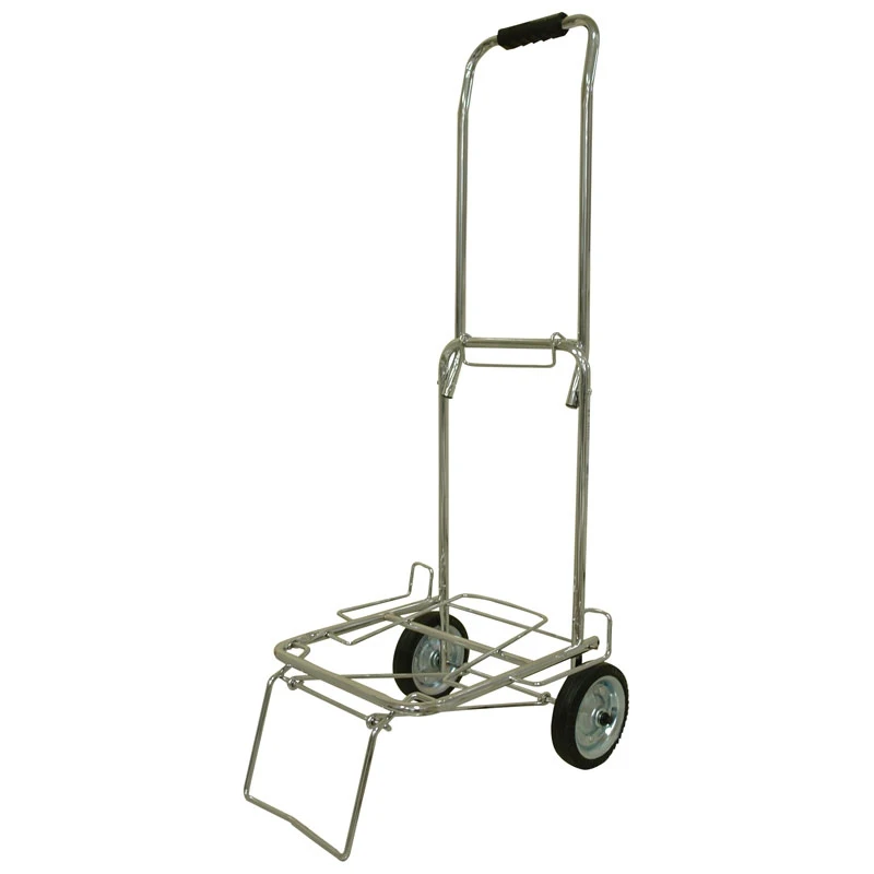 Тележка хромированная Материал: хромированный металл, пластмасса, резина Размер: 39х32,5х101 см Металлические колеса: 14,5х3,6 см Грузоподъемность: 70 кг Вес: 3,13 кг Притяжной ремень: 120 см Упаковка: П/э пакет с биркой