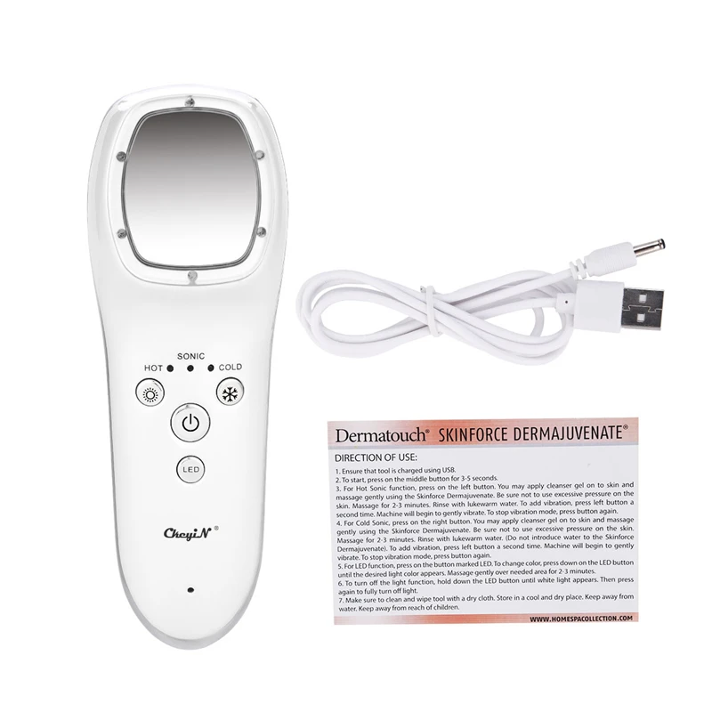 Он имеет 4 функции: горячую терапию, холодную терапию, ультразвуковую вибрацию и функцию светодиодной фотонной терапии.