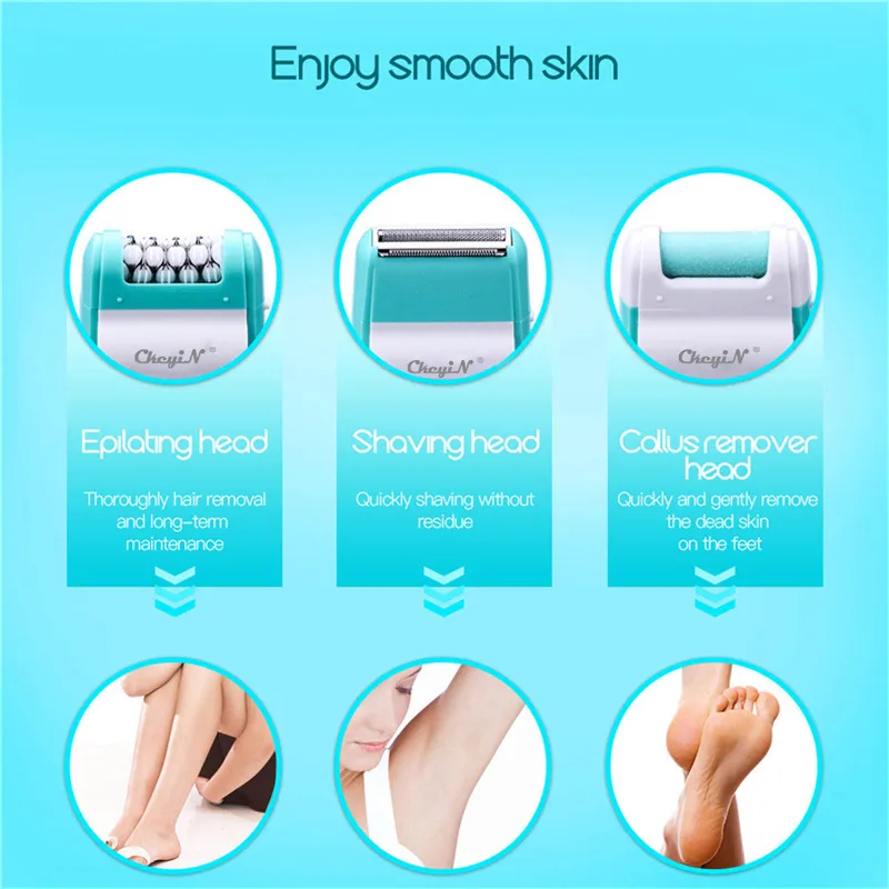 Особенности: Эпиляционная головка и бритвенная головка: помогает легко и эффективно удалять нежелательные волосы с рук, ног, подмышек, бикини и других чувствительных мест. Безопасно удаляет волосы без порезов и косточек, делает вашу кожу шелковистой гладкой и свободной от волос в течение нескольких недель. Головка для удаления мозолей: ролик вращается на 360 градусов, удаляет густую омертвевшую кожу, мозоли, обветренную кутикулу быстро и безопасно. Обратите внимание: 1. Замеры сделаны вручную, поэтому возможны отклонения на 1-3 см. 2. Цвета могут отличаться, так как на разных дисплеях, пожалуйста, поймите. 3. Корпус и адаптер не являются водонепроницаемыми, пожалуйста, держите их сухими; Но головки можно снять, чтобы помыть. 4. Не используйте и не размещайте этот продукт рядом с ваннами, раковинами и другими составами, содержащими воду. Спецификация: Основной Материал: АБС-пластик Входное напряжение: 220-240V 50/60Hz Потребляемая мощность: 4,5 Вт Выход: 3 В 200 мА Тип батареи: 2*600 мАч Ni-MH батареи Время использования: 40 минут Рабочая температура: 5 ℃ ~ 35 ℃ Содержимое упаковки: 1 х Дамский эпилятор 1 x головка для удаления мозолей 1 x бритвенная головка 1 х Защитный чехол для эпиляционной головки 1 x защитная крышка для удаления мозолей Адаптер-1 шт. Щеточка для чистки-1 шт.; 1 х Руководство пользователя (английский/китайский)