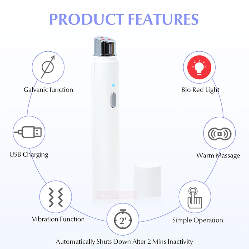 1. Возьмите соответствующее количество сыворотки или крема для глаз и нанесите его вокруг глаз int. 2. Снимите головку и нажмите кнопку включения в первый режим: синий светильник + ион-+ вибрация (низкий) 3. Удерживайте устройство (прикоснитесь к индуктивному стержню на задней оболочке) и перемещайте устройство от внутреннего конера глаза вдоль нижней линии глаза к виску. 4. Нажмите кнопку переключения снова, устройство войдет в Второй режим: Красный светильник ion-+ вибрация (высокая) + тепло 5. Затем массируйте кожу вокруг глаз с одной стороны на другой стороне, оставайтесь в каждой точке в течение 10 секунд, повторите 2-3 раза. 6. Нажмите кнопку переключения снова и выключите машину. После использования, пожалуйста, протрите массажную головку влажной тканью или бумажным полотенцем, а затем накройте головной убор.