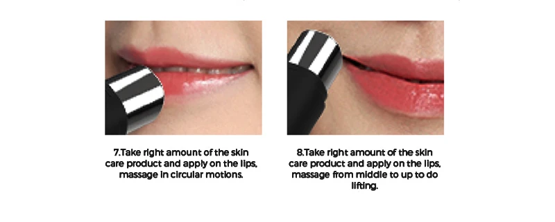 7. Возьмите нужное количество средства по уходу за кожей и нанесите на губы, массируйте круговыми движениями. 8. Возьмите нужное количество средства по уходу за кожей и нанесите на губы. Массаж от середины до подъема.