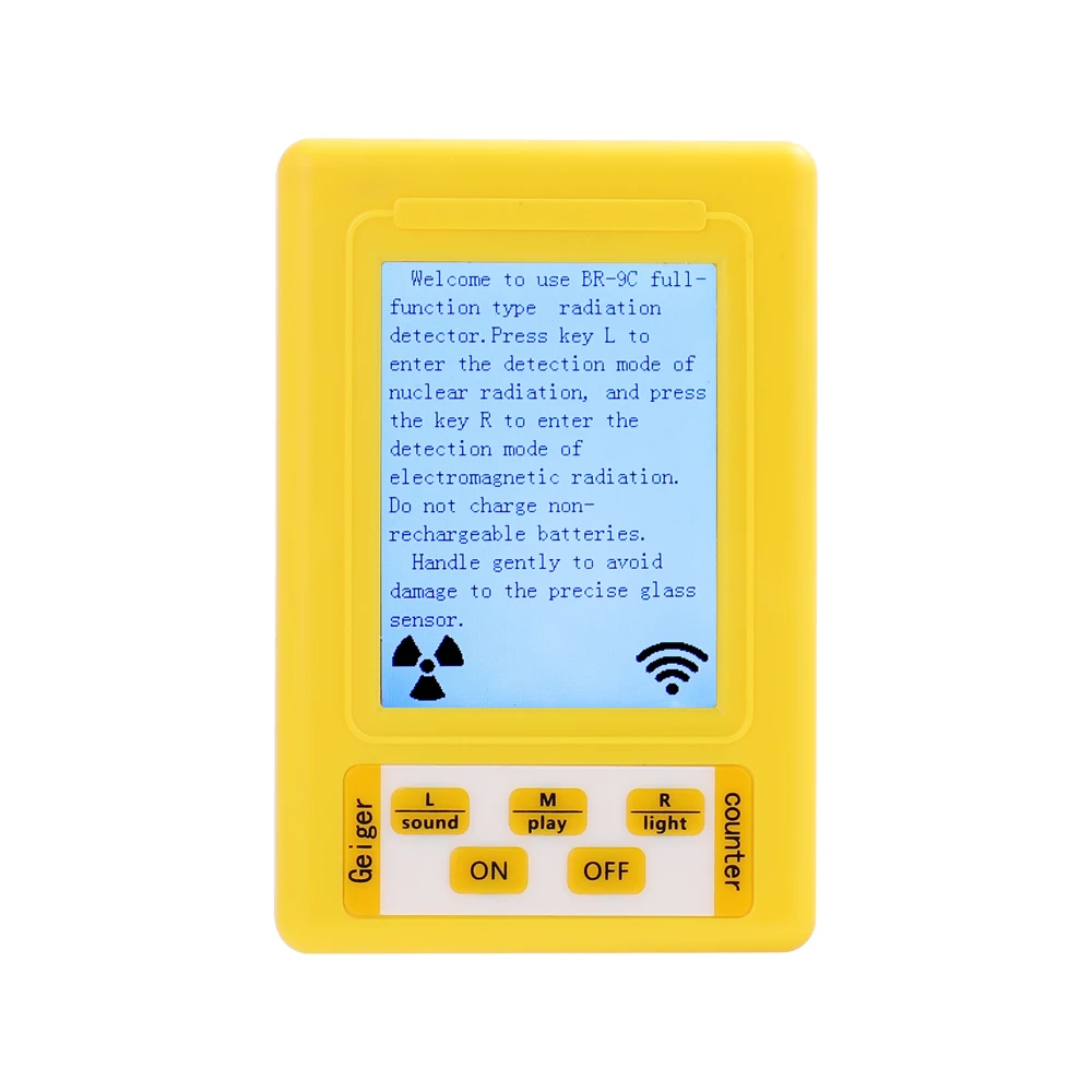 Material: ABS Color: yellow Model: BR-9C Screen size: 57 * 43mm / 2.2 * 1.7in Electromagnetic radiation test: Test range: Power density: 0-99.999μw/c㎡ Electric field intensity: 0-999.99v/m Magnetic field intensity: 0-99.999μT Test accuracy: Power density: 0.001μw/c㎡ Electric field intensity: 0.01v/m Magnetic field intensity: 0.001μT Frequency range: Power density: 50MHz-5GHz Electric field intensity: 20Hz-100MHz Magnetic field intensity: 20Hz-1MHz Nuclear radiation test: Sensor type: energy compensation type GM tube Detectable types: Beta, Gamma, X-ray Energy range: 20kev~3.0mev≤±30%(137Cs-) Sensitivity: 80cpm/μsv/(Co-60) Test accuracy: 0.01μsv/h Real-time range: 0-99.99μsv/h Cumulative range: 0-99.999msv Real-time error: ≤10% Mean error: ≤3% Battery: 3 * AA 1.5V battery or 3 * 1.2V rechargeable battery (not included) Charging: USB 5V 2A input Charging time: ≥4 hours Item size: 105 * 70 * 30mm / 4.1 * 2.8 * 1.2in Item weight: 105g / 3.7ounce Package size: 150 * 100 * 55mm / 5.9 * 3.9 * 2.2in Package weight: 169g / 6.0ounce
