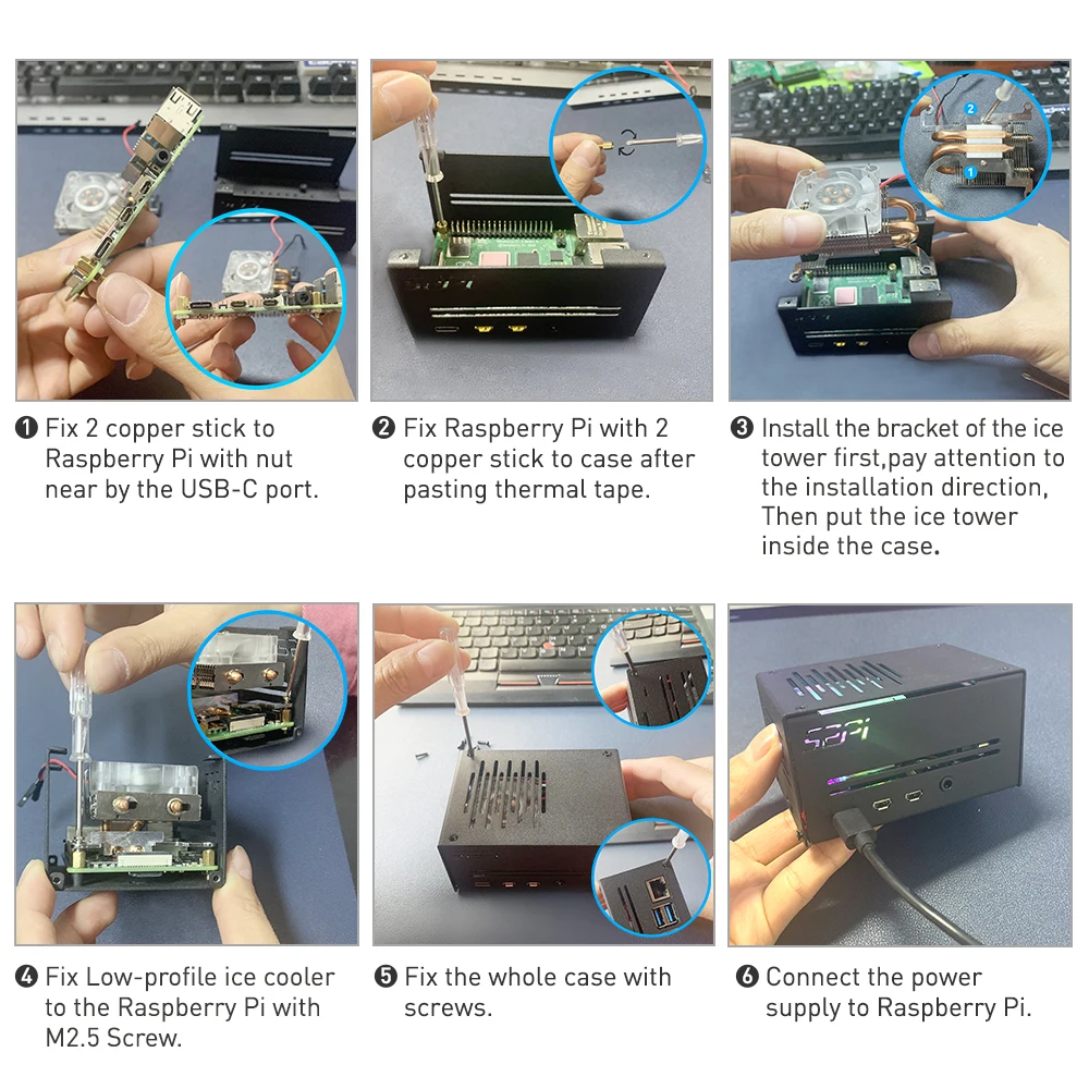 Новый Красочный кулер для ледяной башни 52Pi вдохновлен сборками теплоотвода и вентилятора (HSF), которые занимают лидирующие позиции на рынке настольных ПК. В комплект входят прокладки из материала теплового интерфейса (TIM), монтажные кронштейны и аксессуары для Raspberry Pi 4 и Raspberry Pi 3 Model B/Model B +, крошечная отвертка и маленькое, но полноцветное руководство. Новая функция-использовать совместимый кронштейн и цветной светодиодный вентилятор с автоматическим изменением цвета.