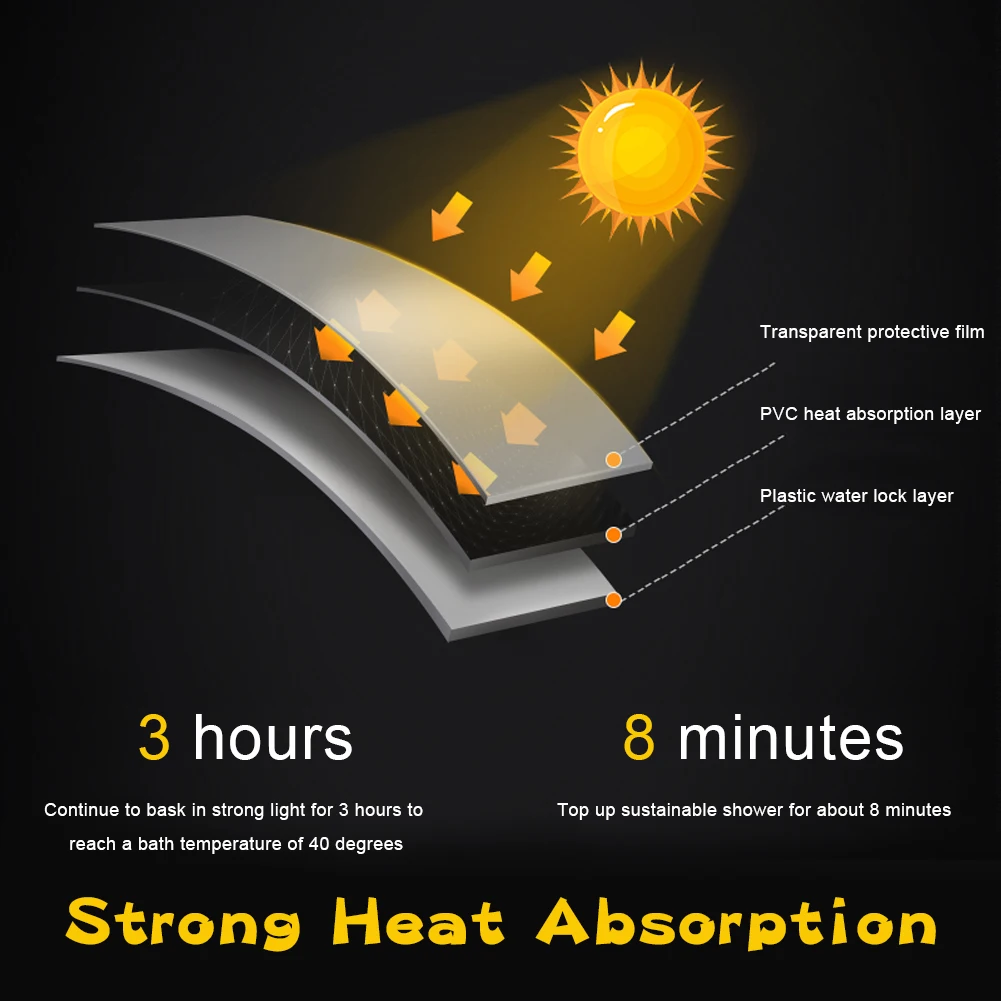 * 5. Положительный: (производство новых материалов, цвет, черный, яркий, поглощает тепловой эффект солнца. * 6. Обычные солнечные мешки для ванной на рынке производятся с возвращенными материалами, цвет тусклый, влияющий на эффект поглощения тепла)