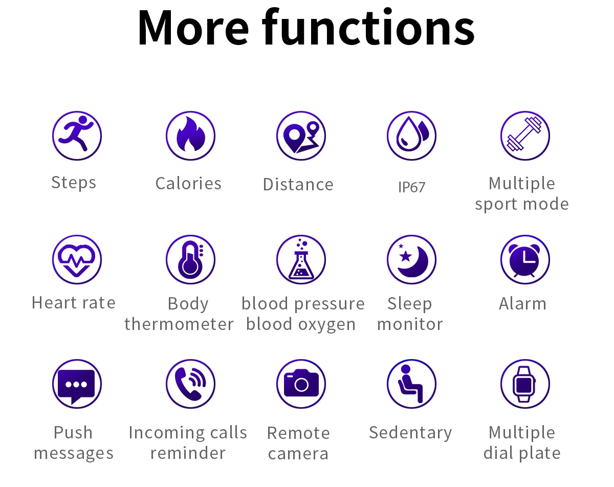 Таймер, шагомер, потребление калорий, расчет расстояния, частота сердечных сокращений, кровяное давление, время сна/ВКЛ и ВЫКЛ.