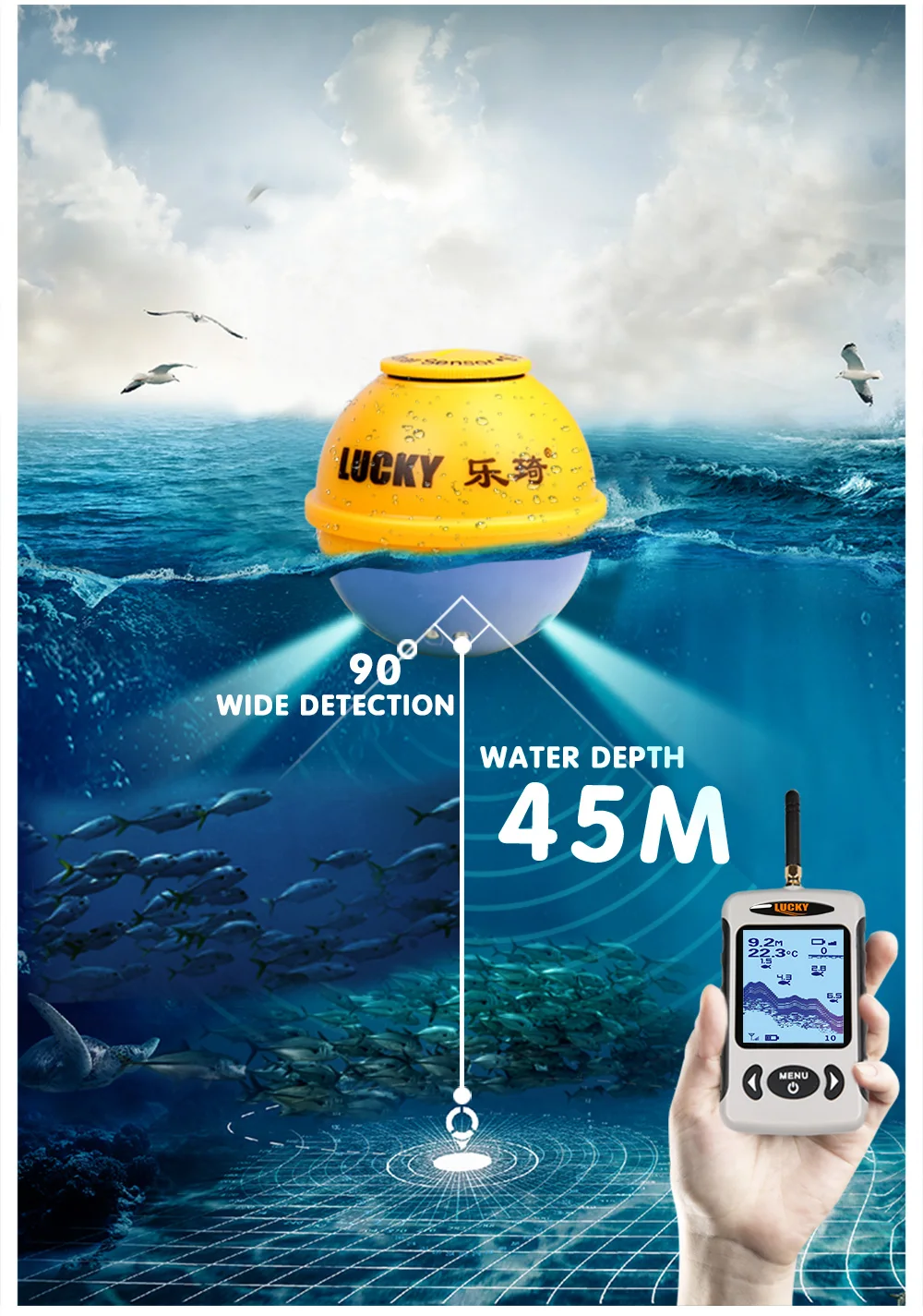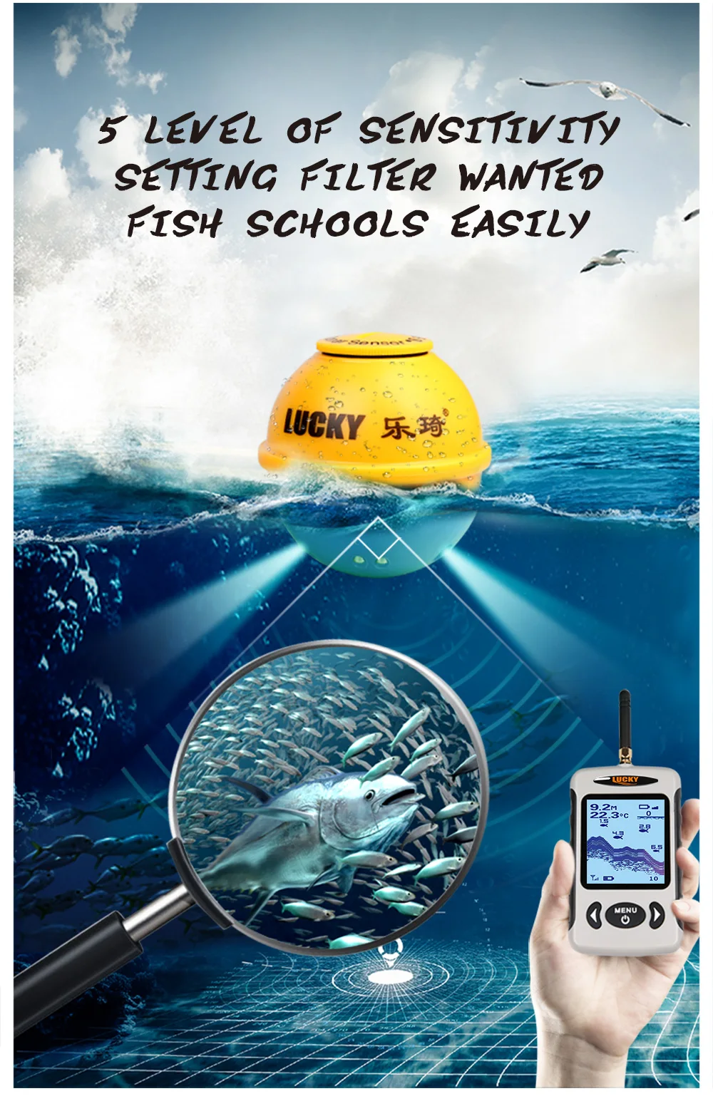 3. Использование рыбопоискового устройства в гладком и твердом месте (например, в аквариуме, бассейне, ведре с водой или пруду с рыбой) может привести к многократному приему гидролокатора, иначе обнаружение может быть неточным. Пожалуйста, используйте эхолот в глубокой воде.